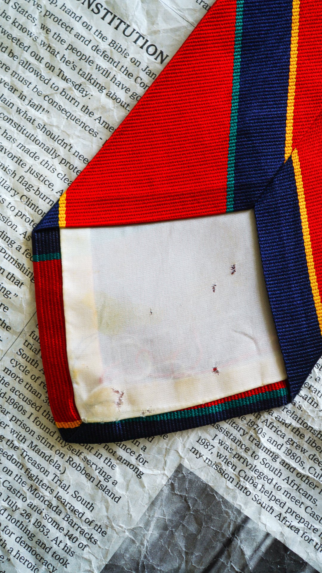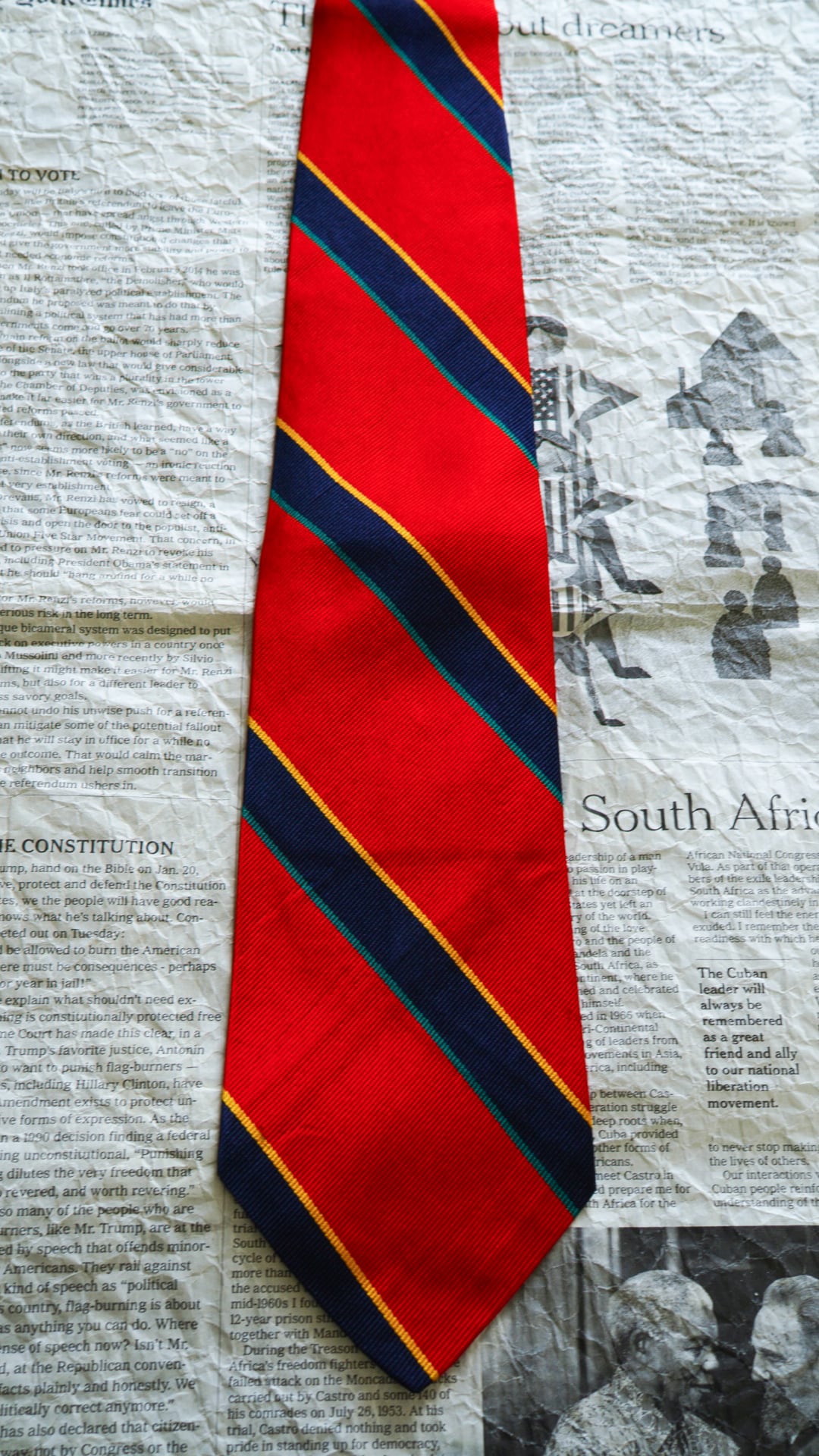 シルク100%の光沢がある生地で作られた定番のレジメンタルストライプ柄のネクタイで、カラーはレッド×ネイビー×グリーン×イエローの配色になります。
