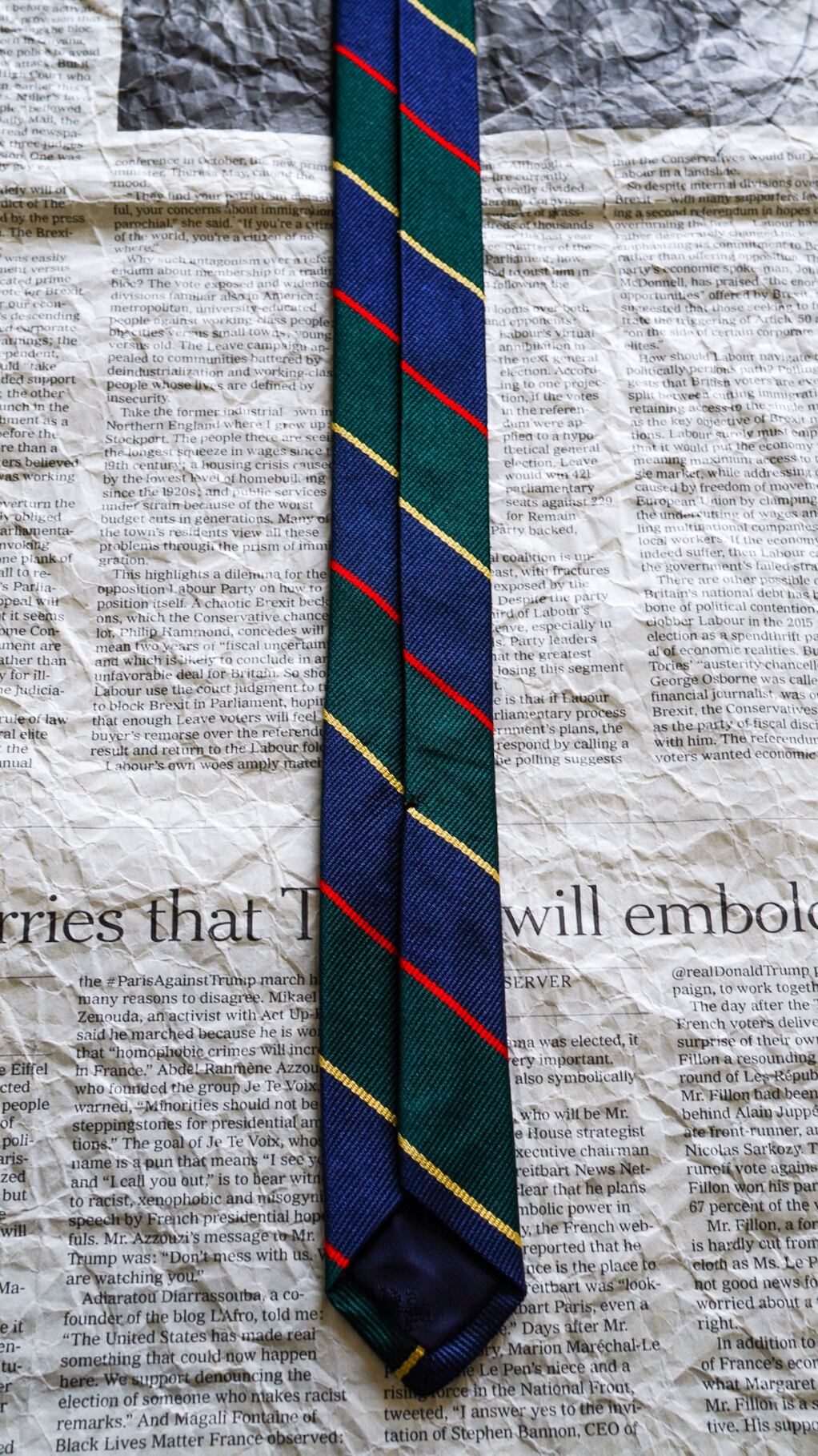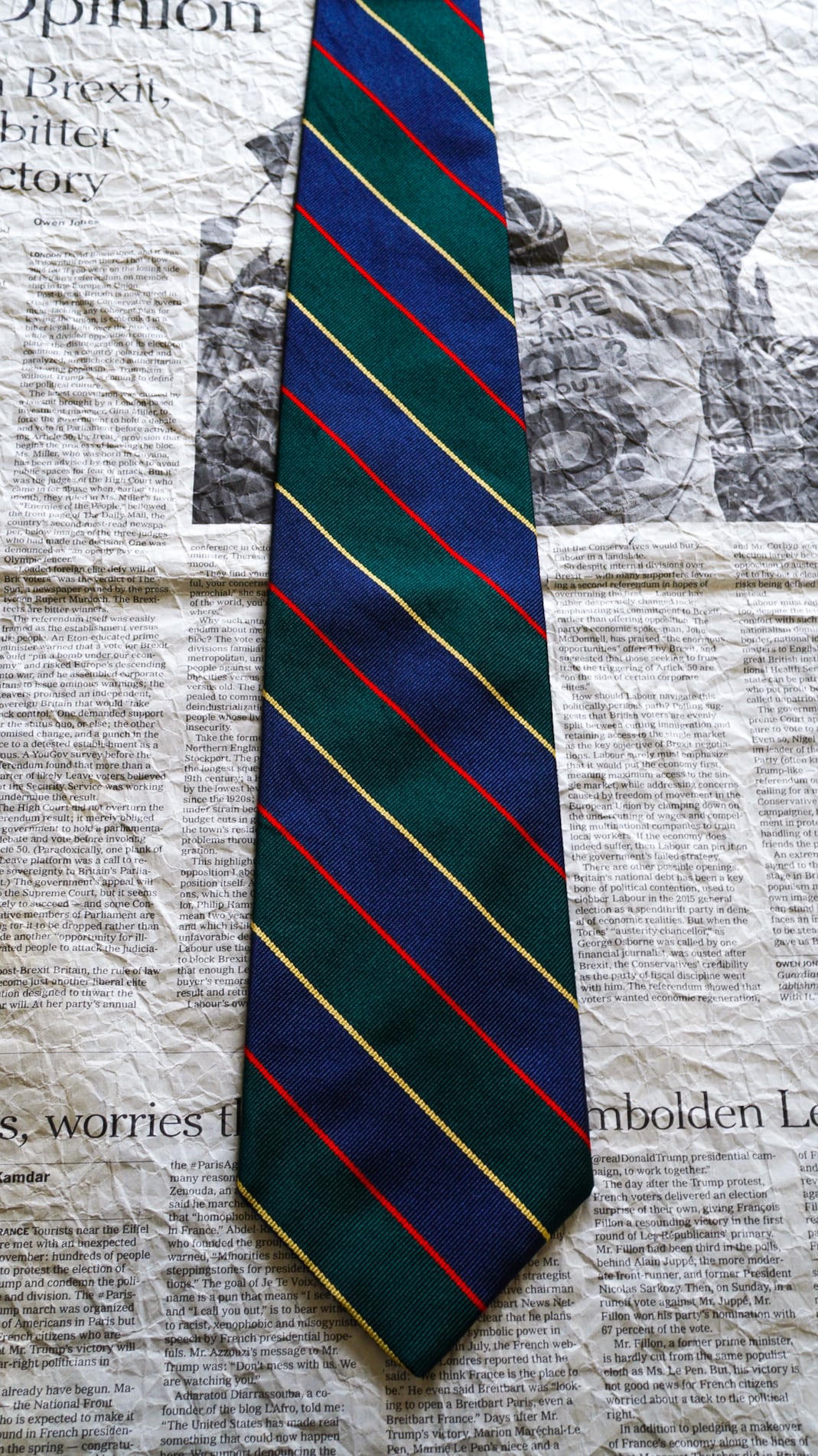 シルク100%の光沢がある生地で作られた定番のレジメンタルストライプ柄のネクタイで、カラーはグリーン×ネイビー×レッド×ゴールドの配色になります。