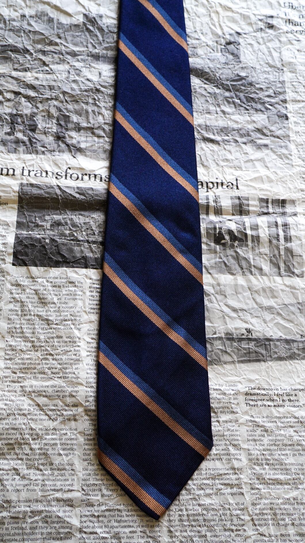 シルク100%の光沢がある生地で作られた定番のレジメンタルストライプ柄のネクタイで、カラーはネイビー×ミッドブルー×キャメルの配色になります。
