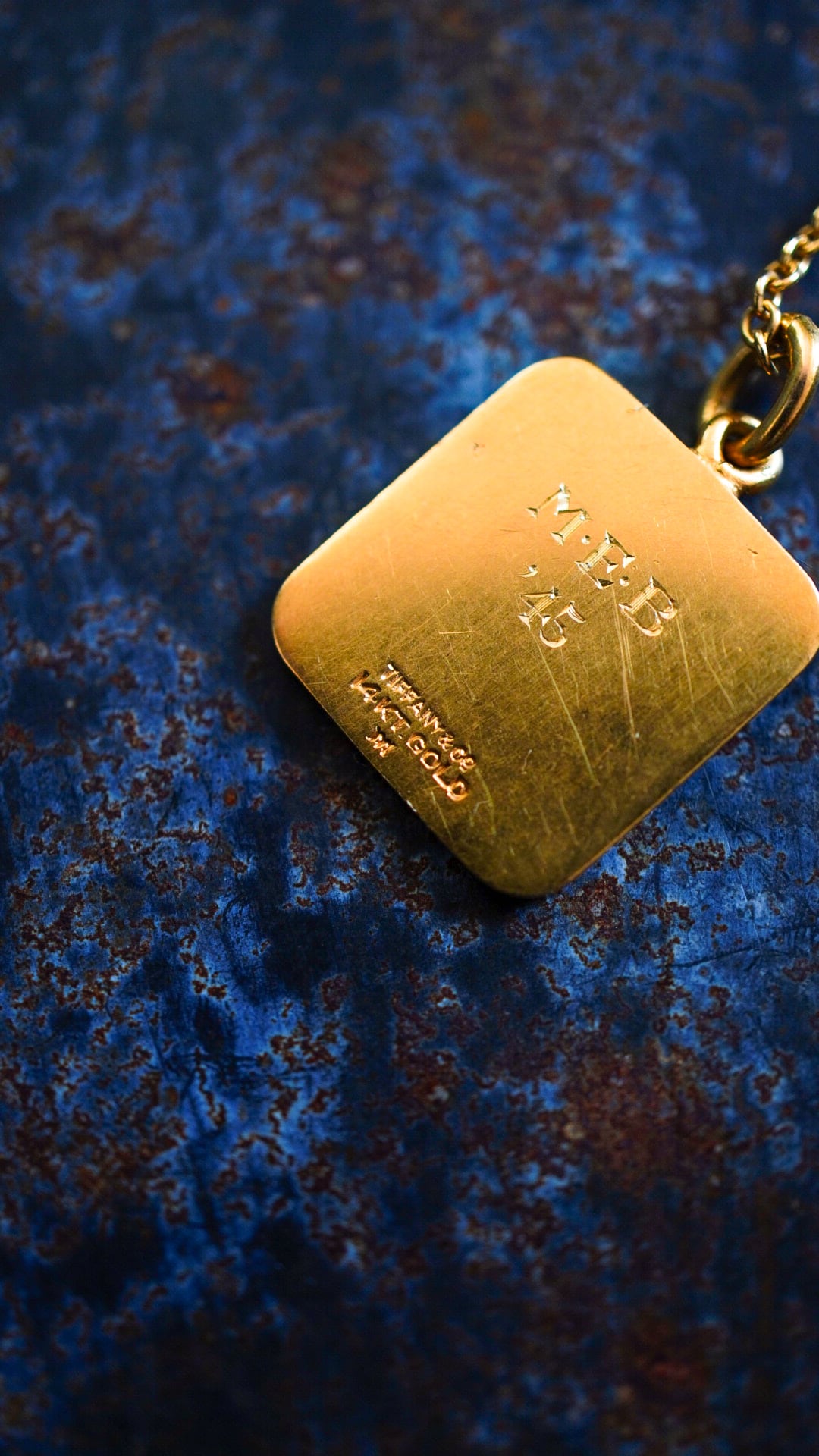 チャームの裏面には、「M・E・B (イニシャル)」「'45 (卒業年度)」「TIFFANY&CO」「14KT GOLD」等の刻印が入ります。
