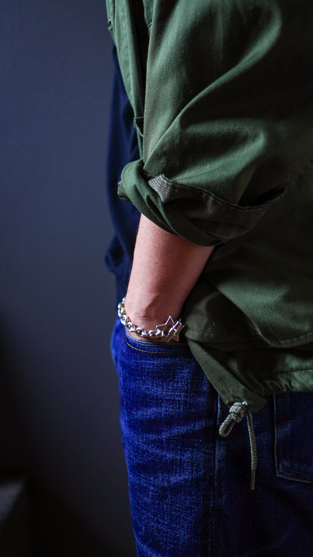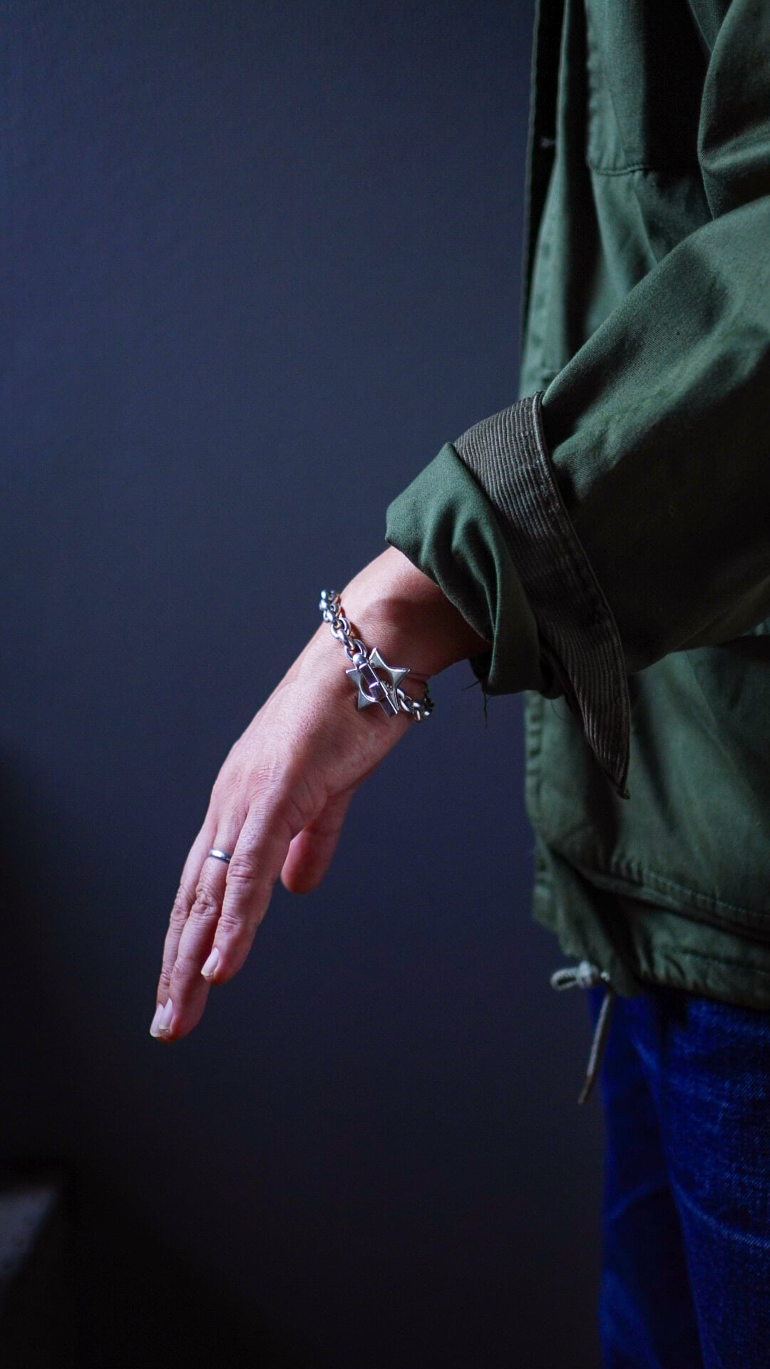 トグルをスターのホールに通して留める仕様で、ご着用頂いた際にはこの部分が絶妙なアクセントとして手元を引き立てます。