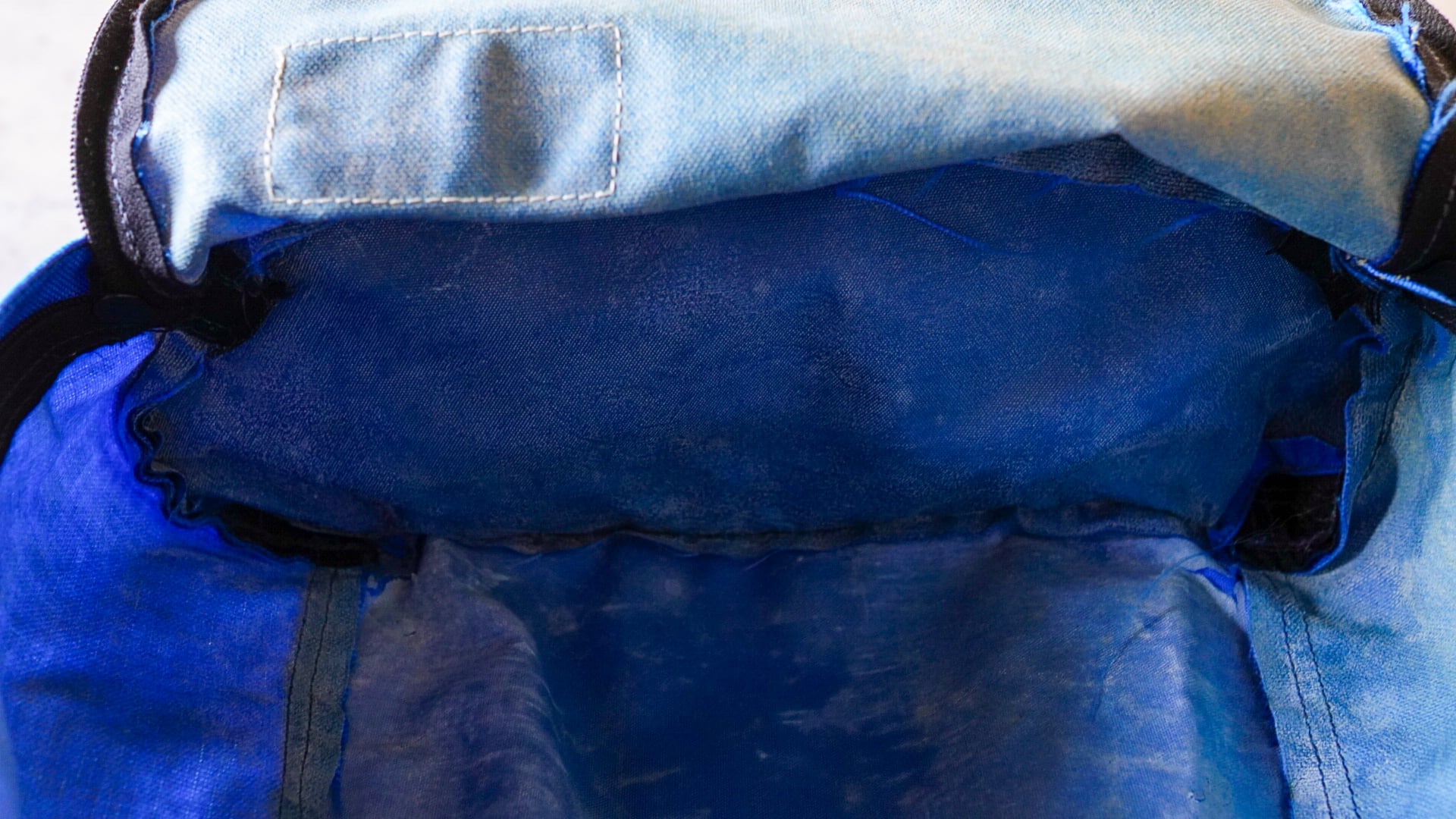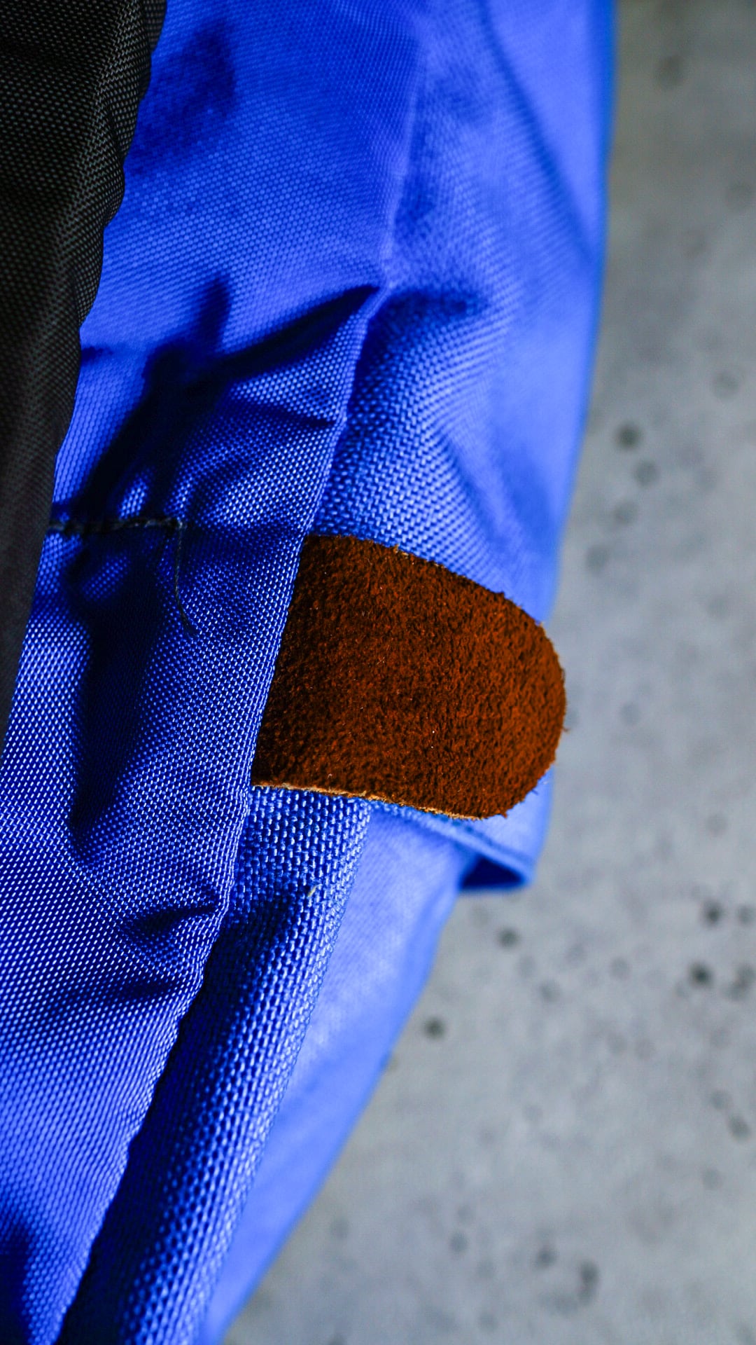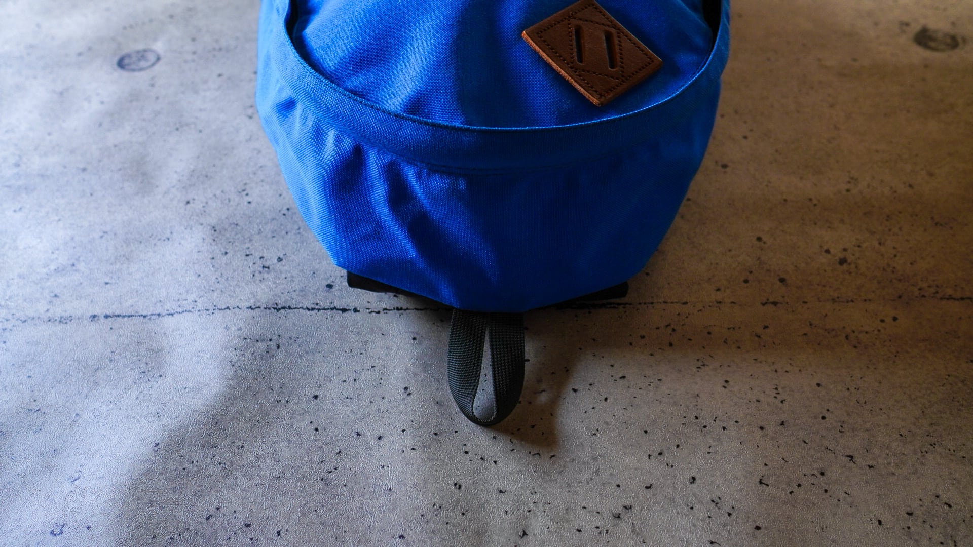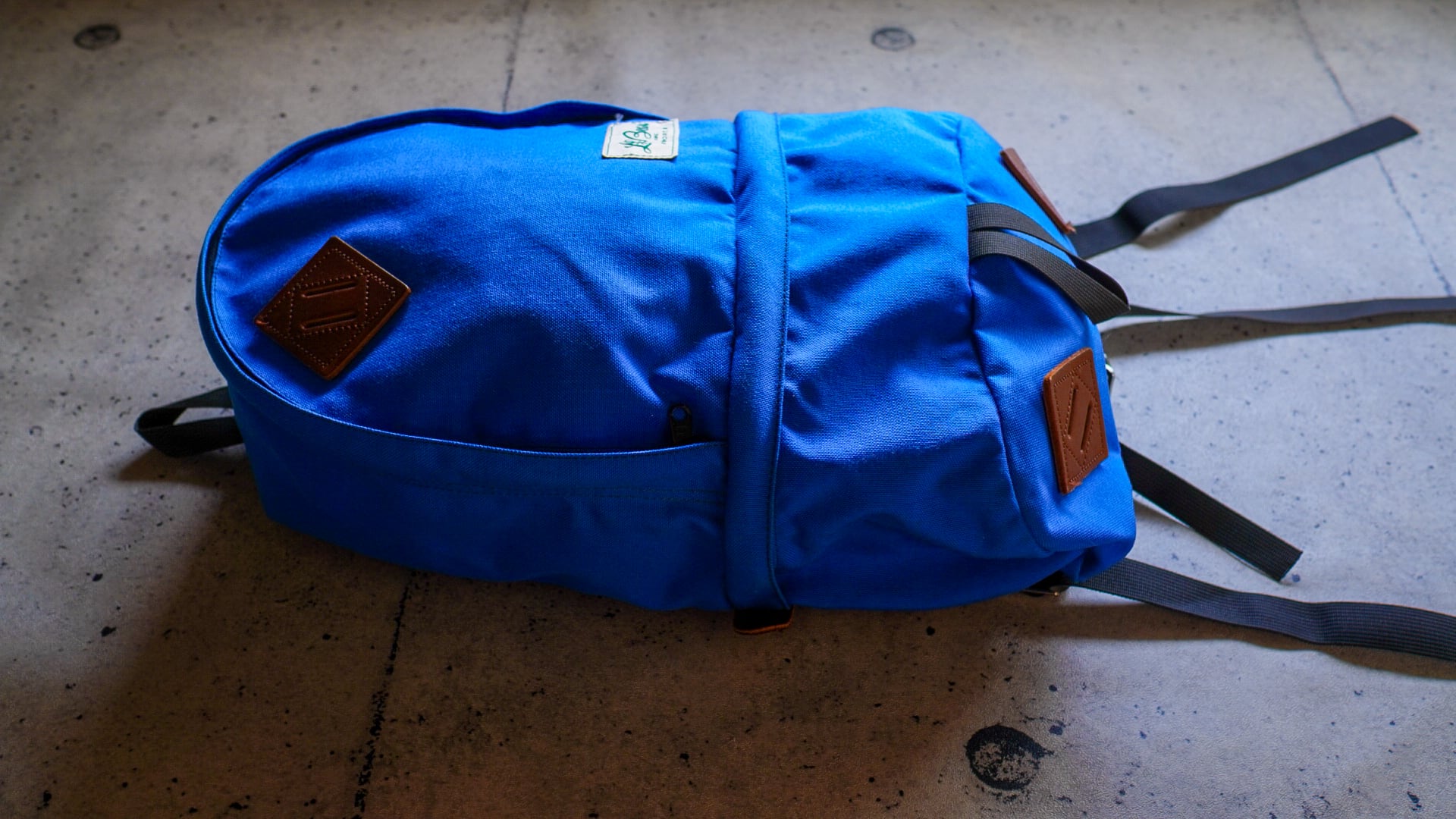 上部がコンパクトで下に向かって膨らむ雫型シルエットに、鮮やかなブルー系のコーデュラナイロンボディとレザーパッチ(通称:豚鼻)を組み合わせたクラシックアウトドアを象徴するデザインです。