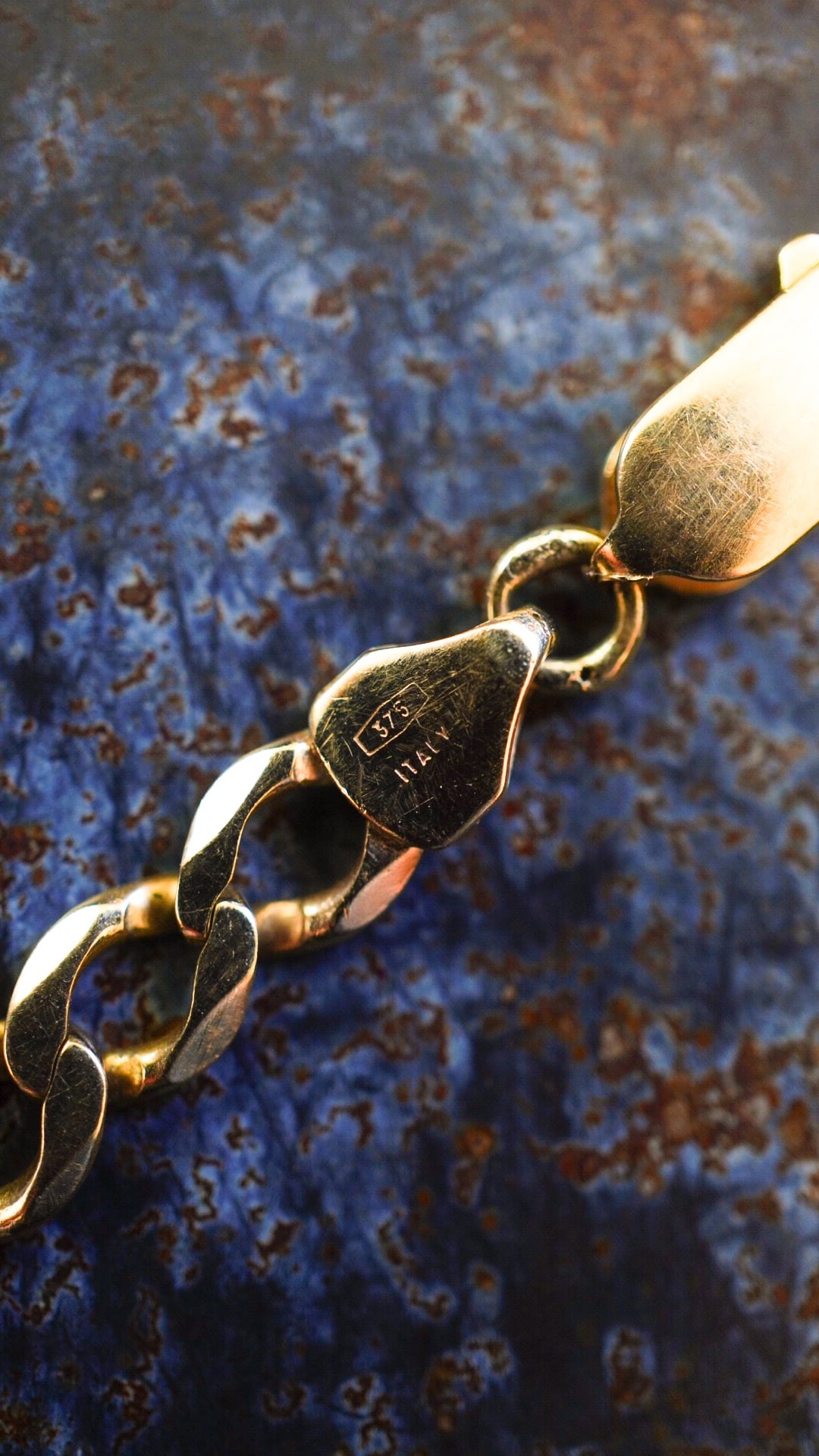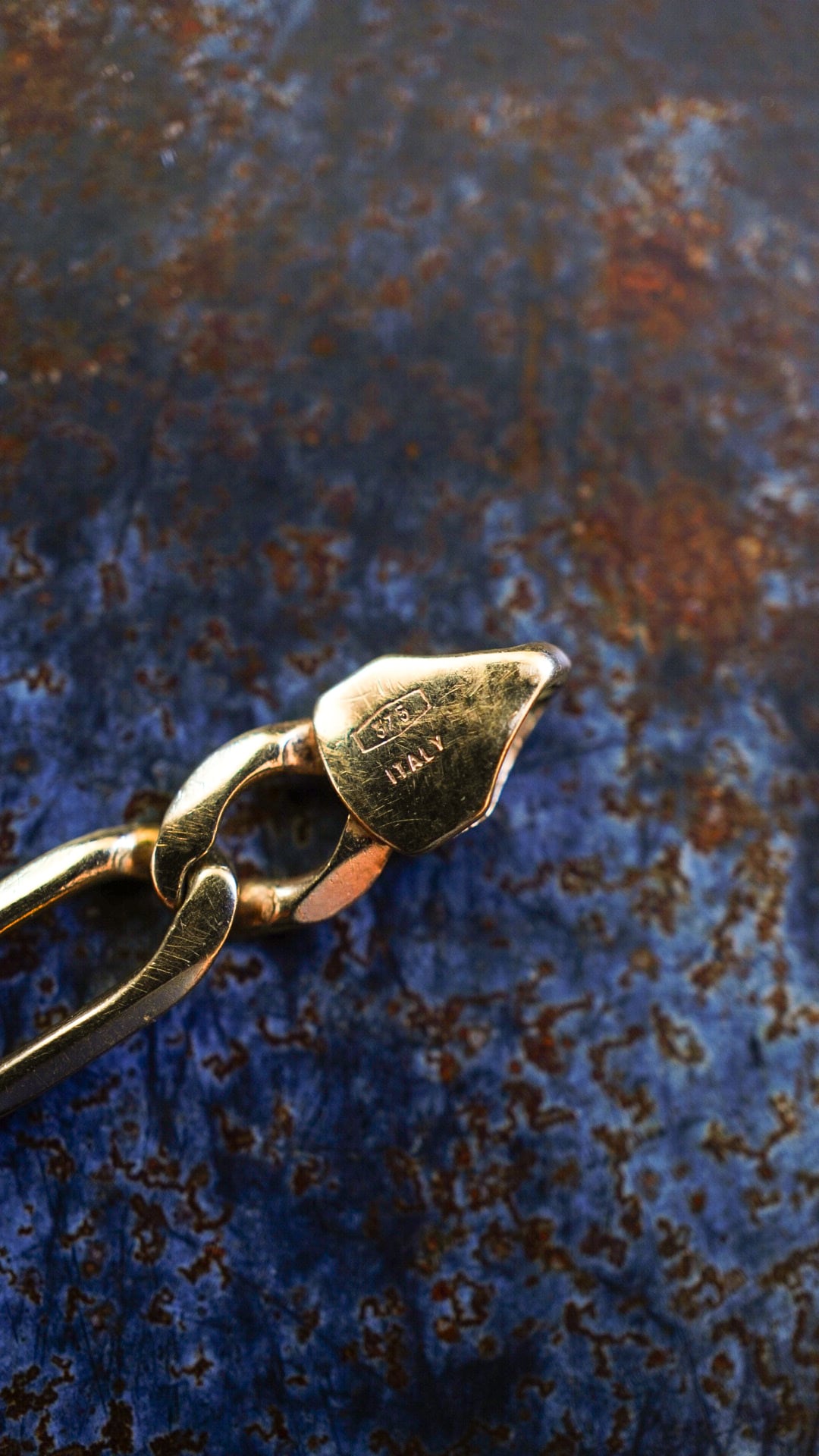 ブレスレットには「375」「ITALY」「天秤マーク(「International Convention Mark」という国際共通刻印)の刻印の他に、「375(9ctゴールド)」「シェフィールドインポート検室所マーク」等、イギリスの刻印(ホールマーク)が入ります。