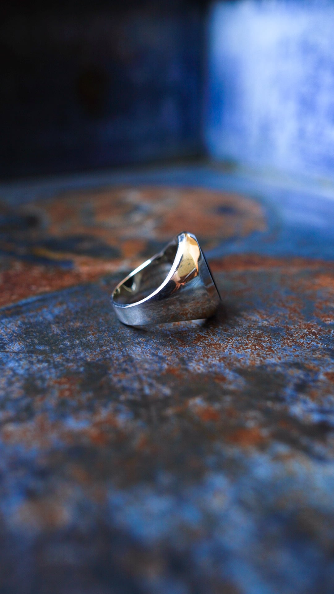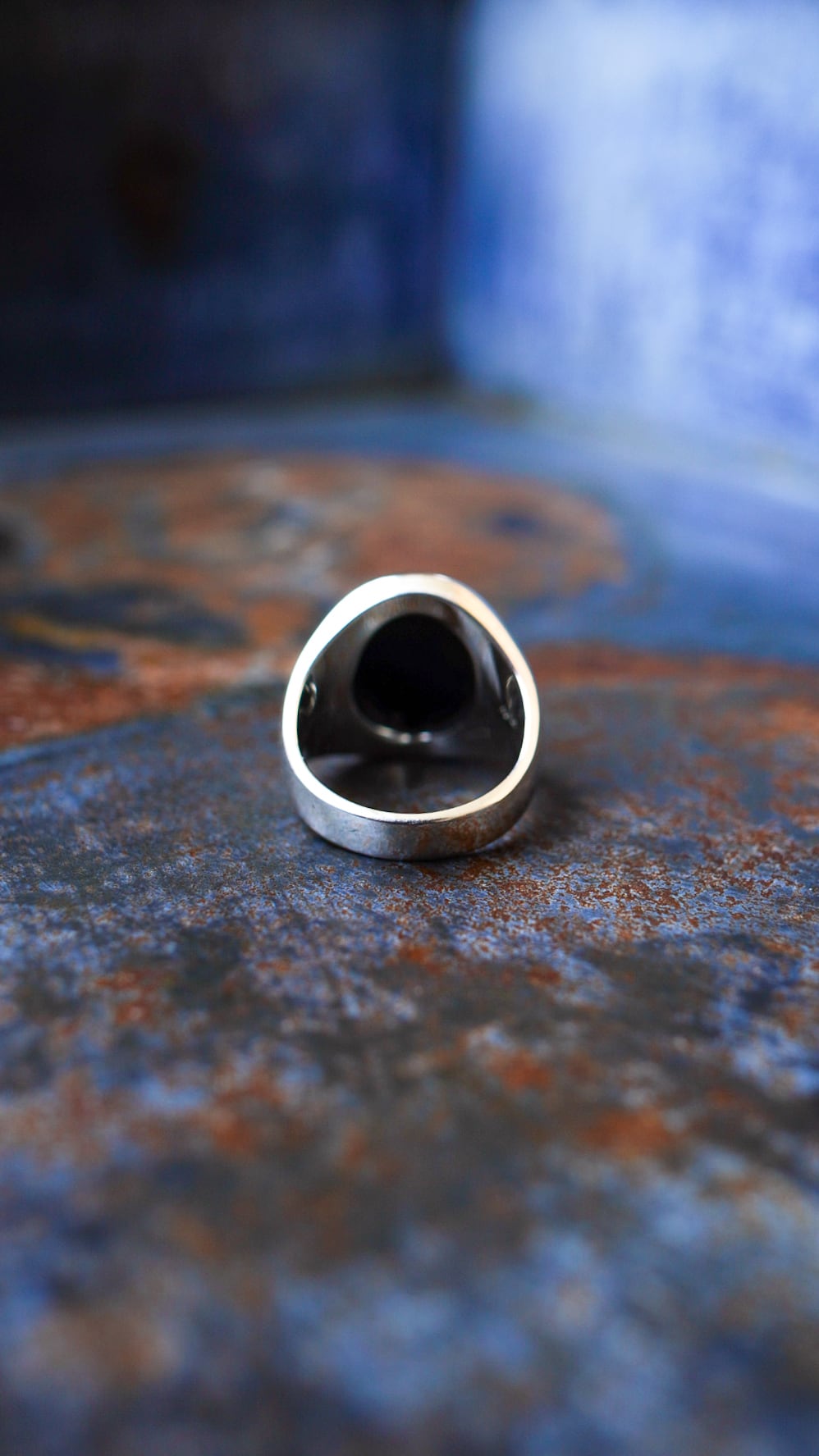 このリングの台座はオーバル型で、リングトップにはブラックオニキスの石がセットされています。