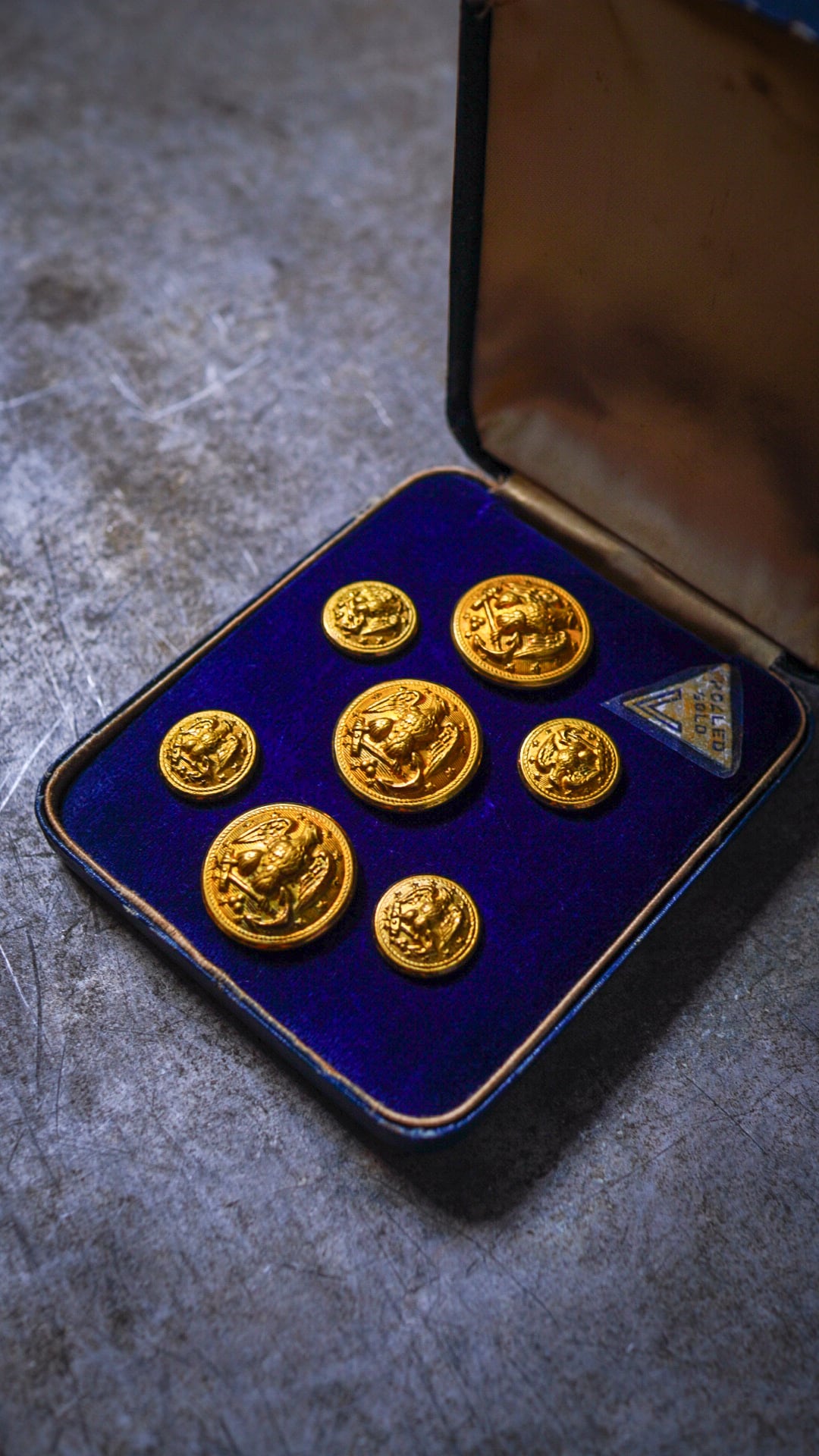 真鍮ベースに金張り加工(Rolled-Gold)が施された高級仕様で、おそらくBROOKS BROTHERSが仕立てていた米海軍将校礼装用ジャケット(U.S. Navy Service Dress Blue Officer’s Jacket)に使用されていたボタンと考えられます。
