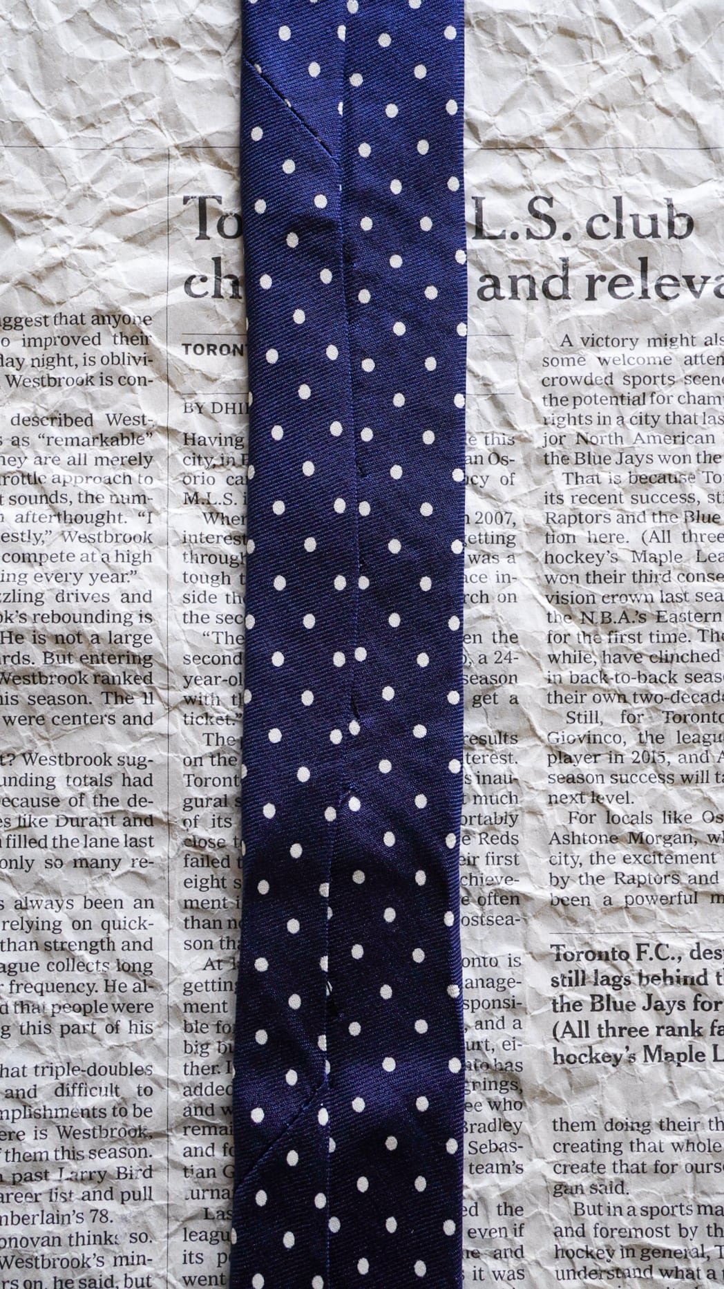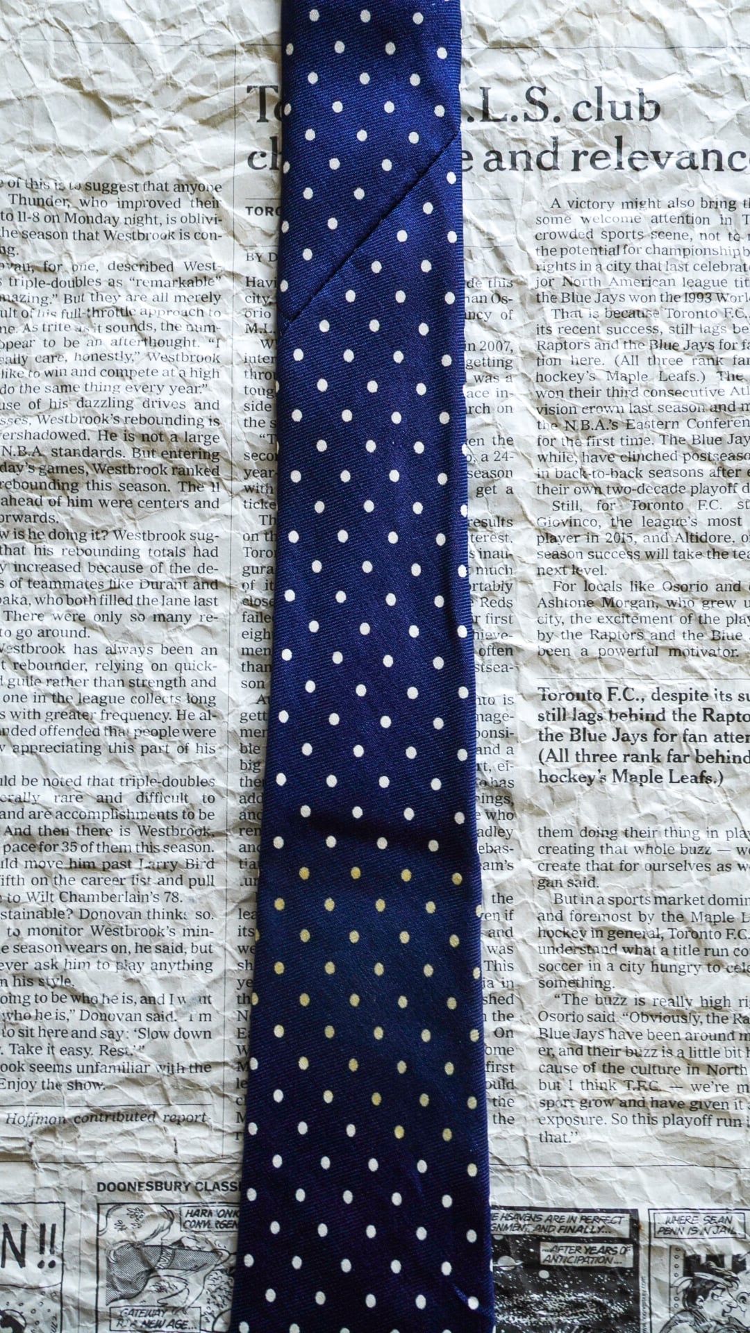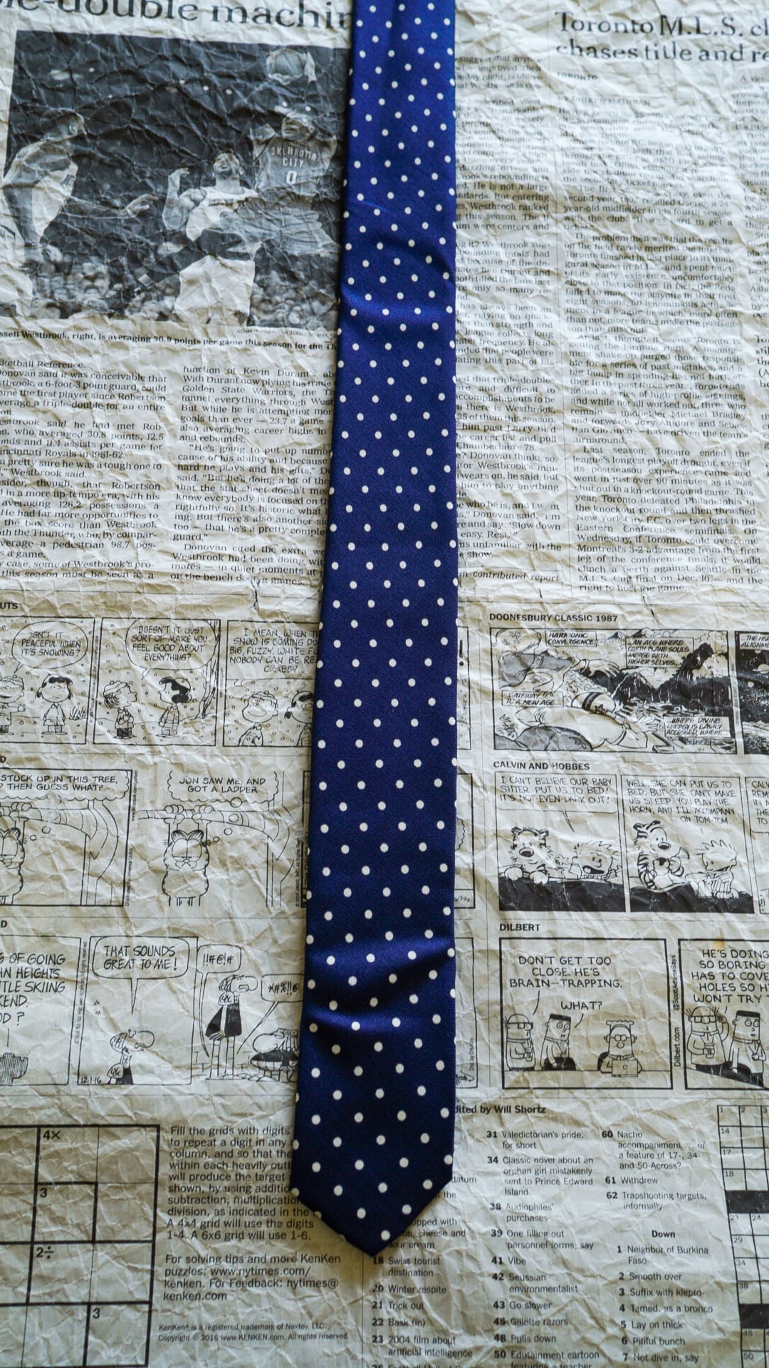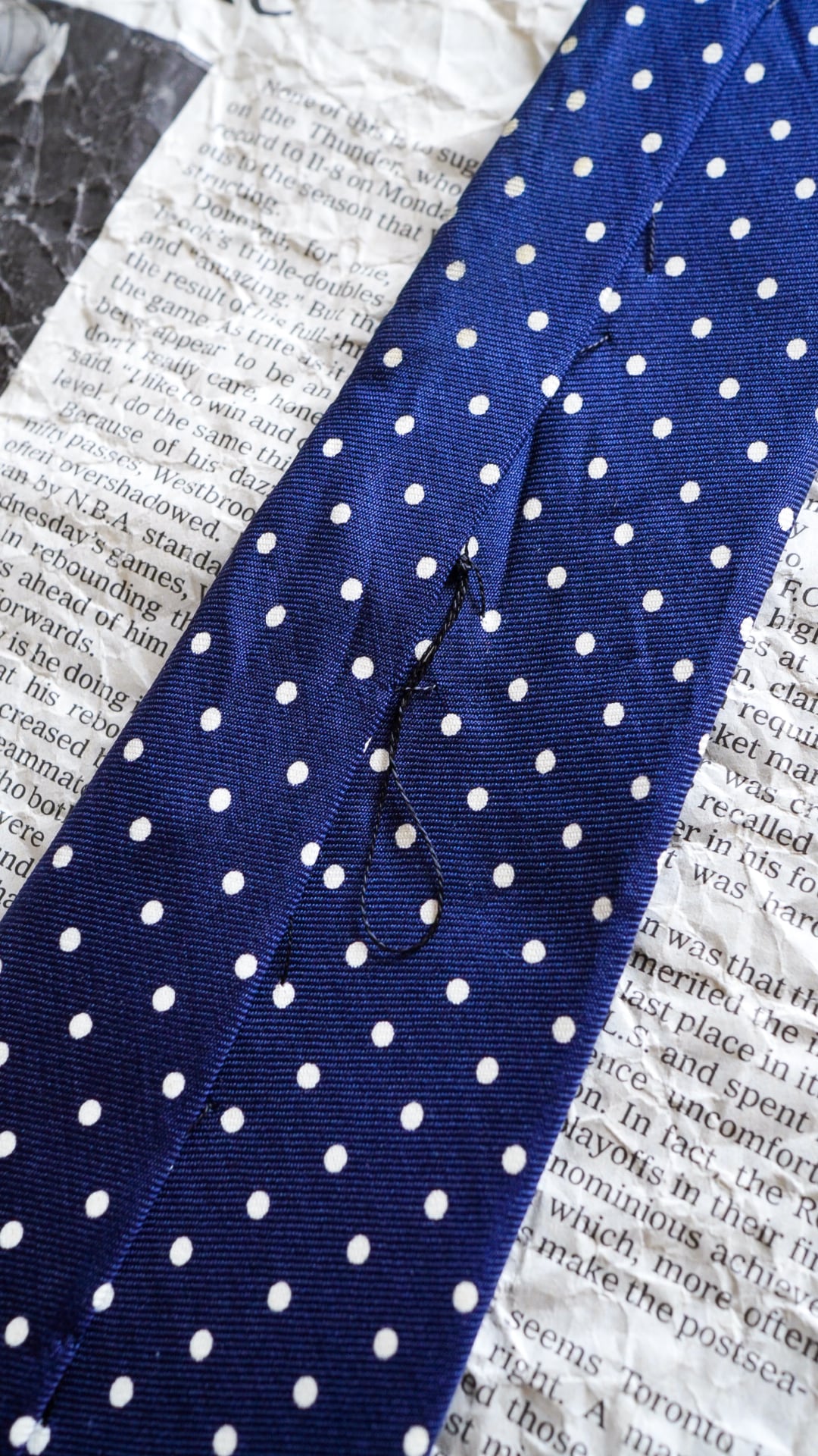 シルク100%の光沢がある生地で作られた定番のドット柄のネクタイで、カラーはネイビー×ホワイトの配色になります。