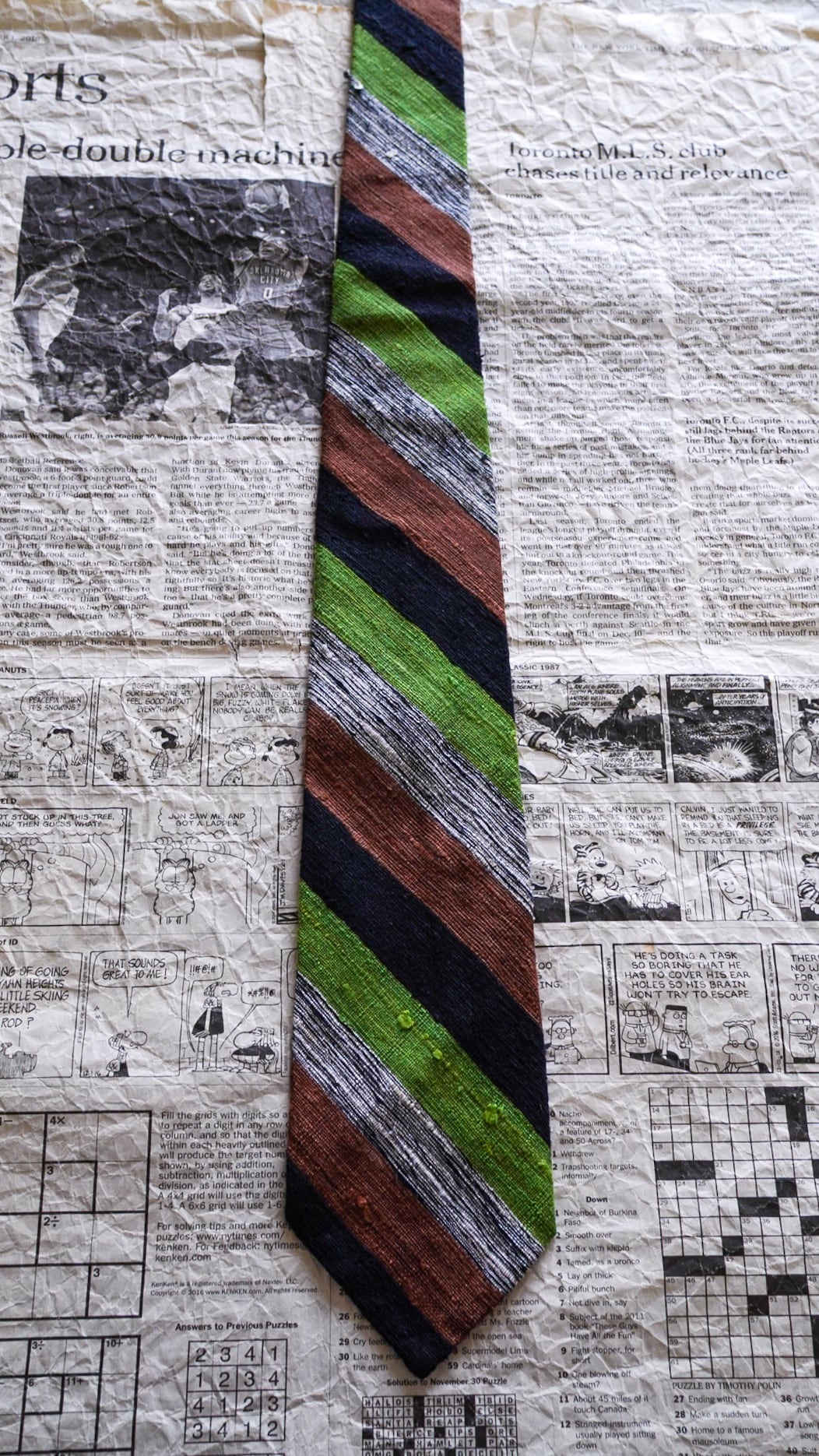 タッサーシルク特有の質感と、部分的に筆描きのような揺らぎを纏ったブラッシュストライプが相まって、通常のレジメンタルストライプとは一線を画す奥行きある表情を生み出しています。