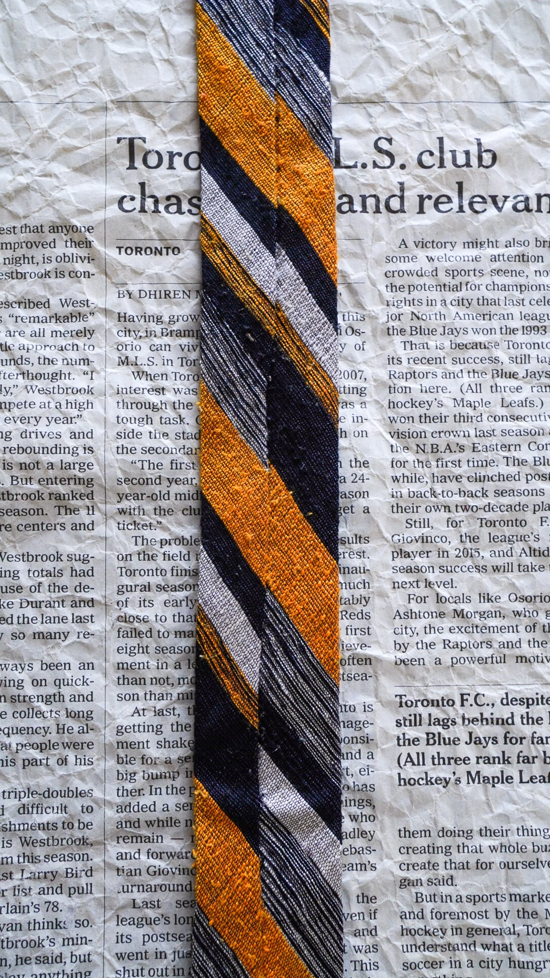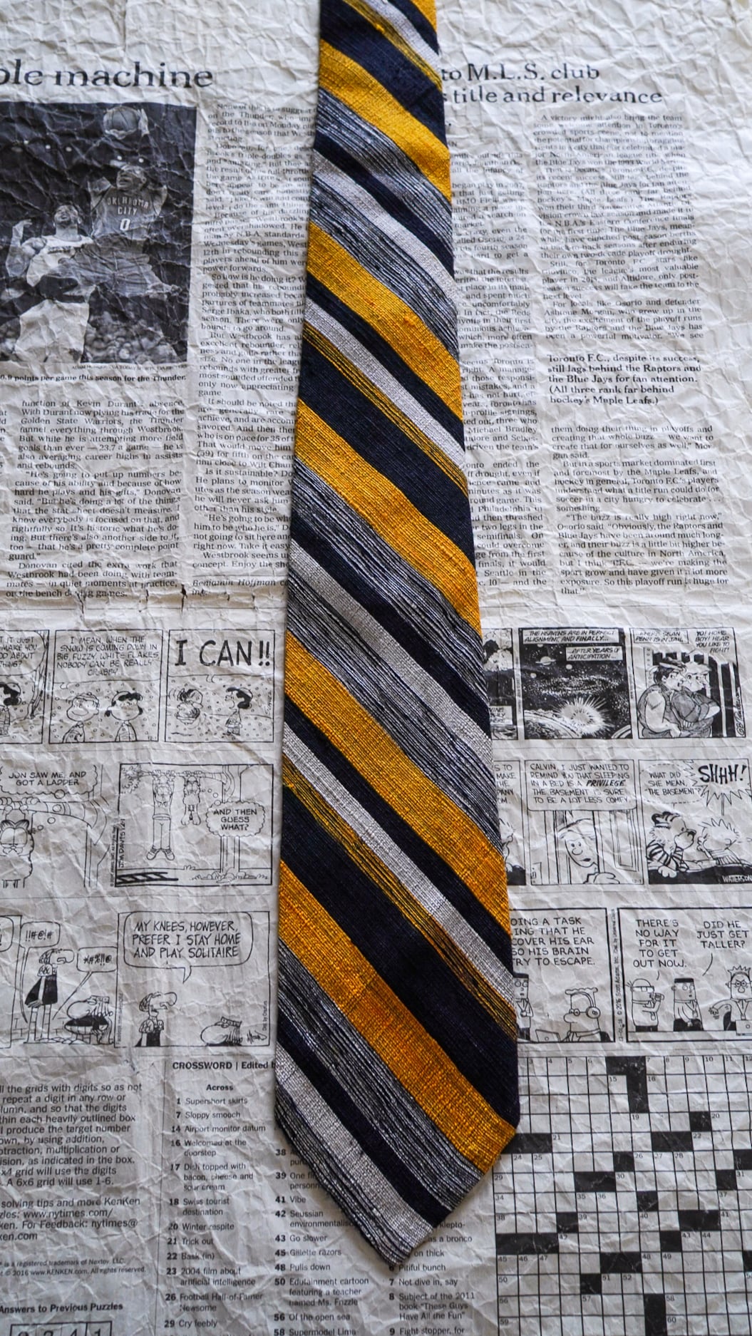タッサーシルク特有の質感と、部分的に筆描きのような揺らぎを纏ったブラッシュストライプが相まって、通常のレジメンタルストライプとは一線を画す奥行きある表情を生み出しています。