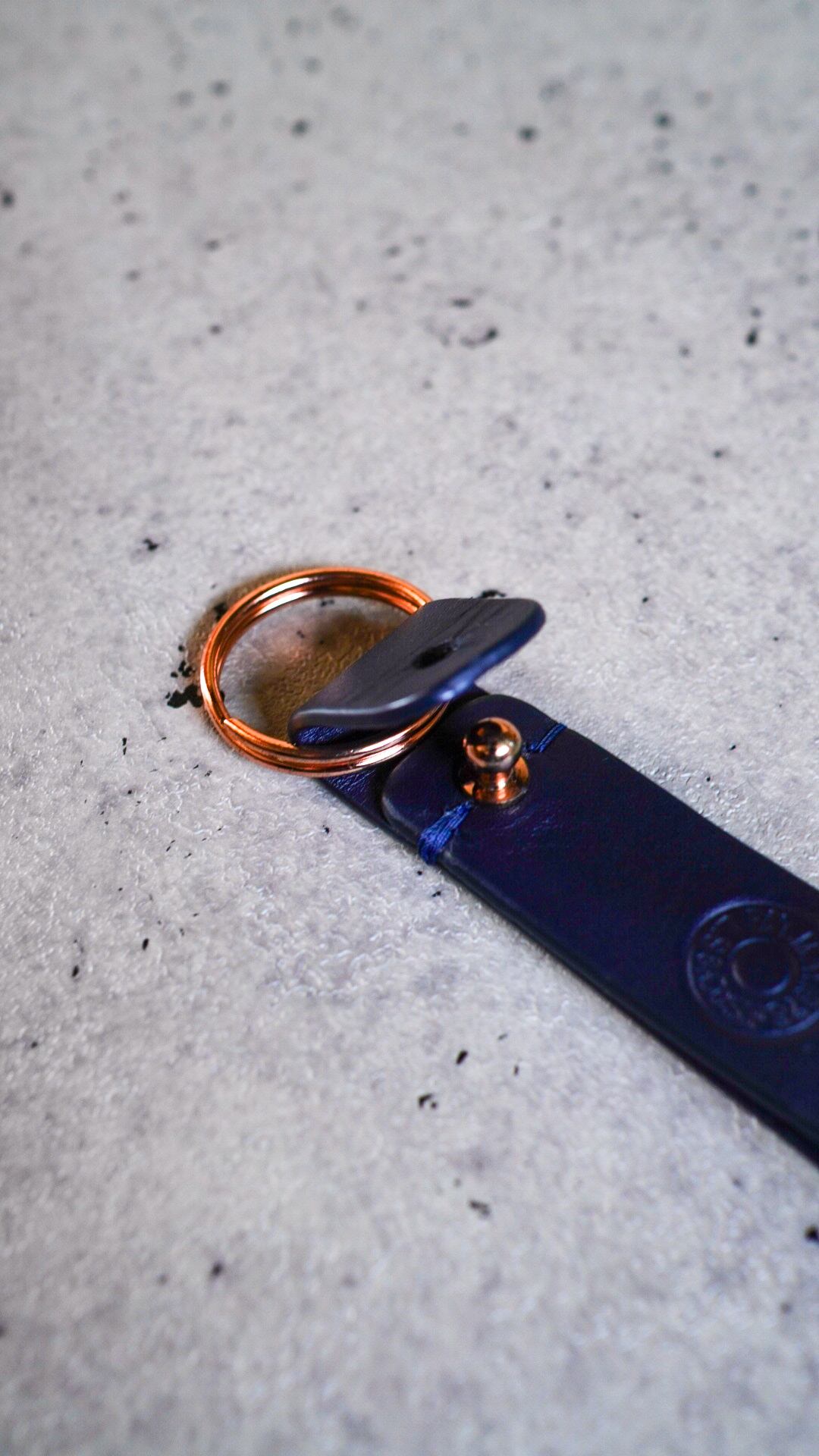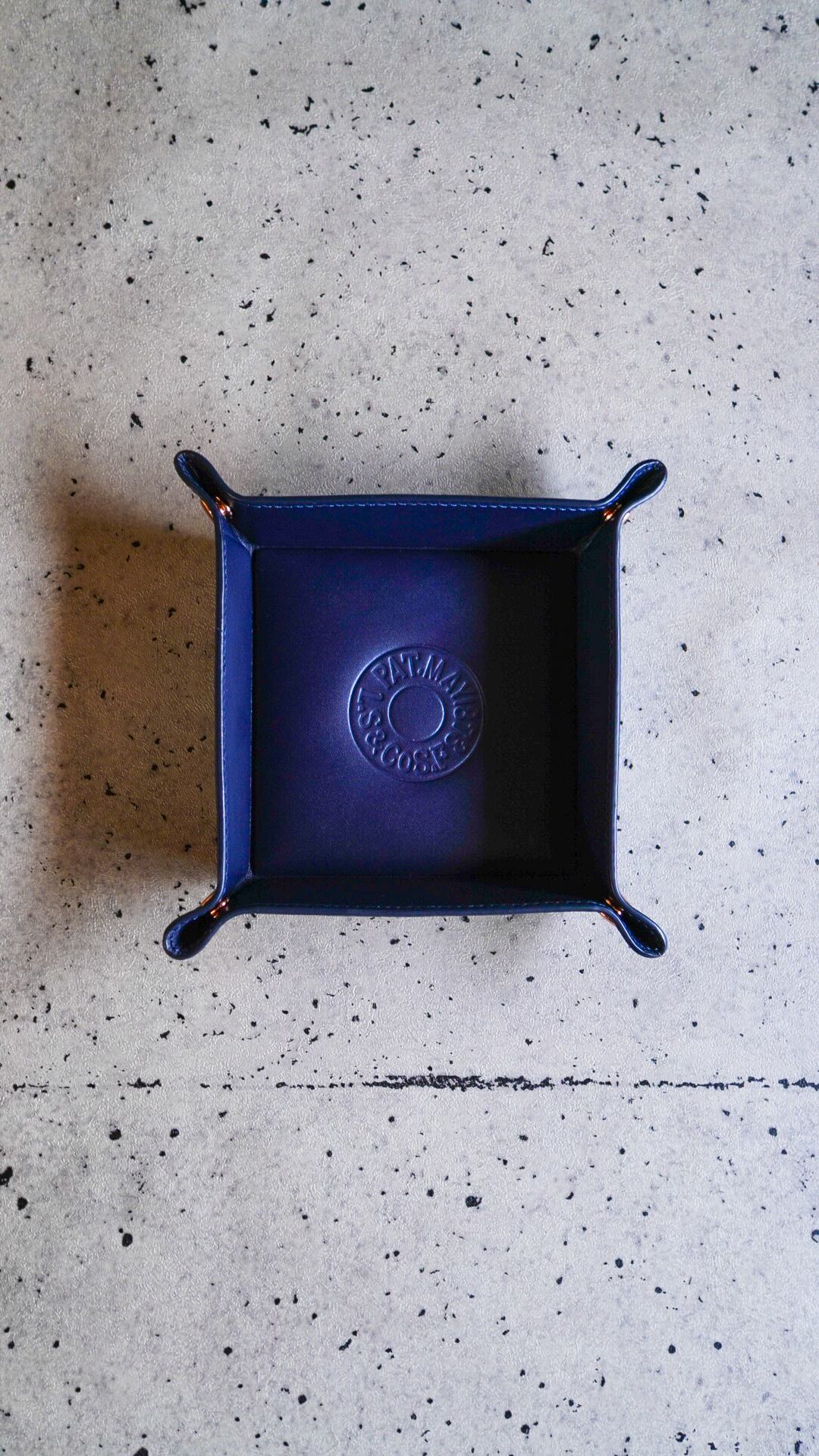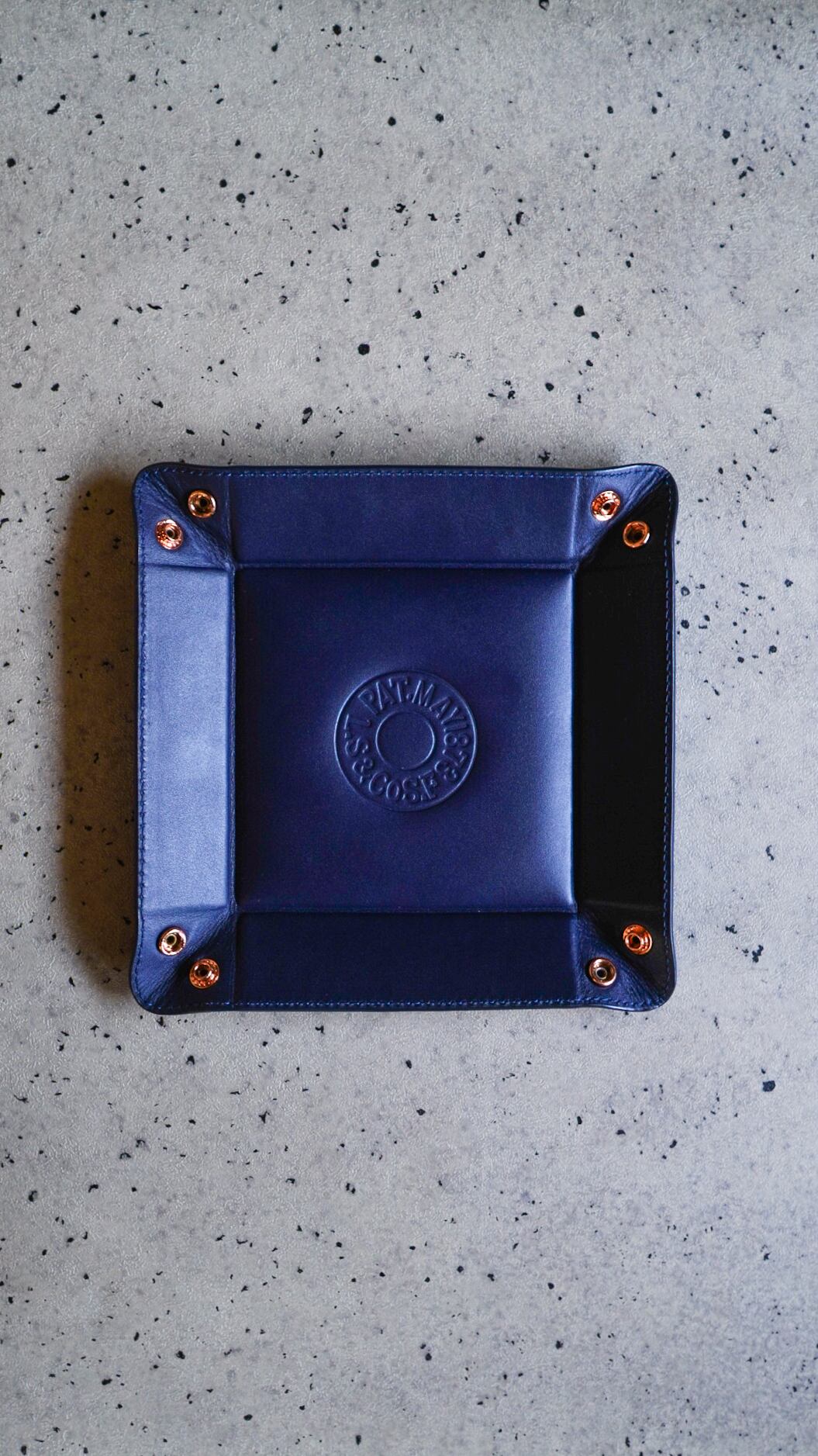 インディゴブルーを連想させる深みのあるネイビートーンで統一されたトレイとキーフォブの2点セットで、いずれも1873年5月20日にリーバイ・ストラウスとヤコブ・デイビスによって取得された、ジーンズ用リベット特許を象徴する刻印が型押しされています。