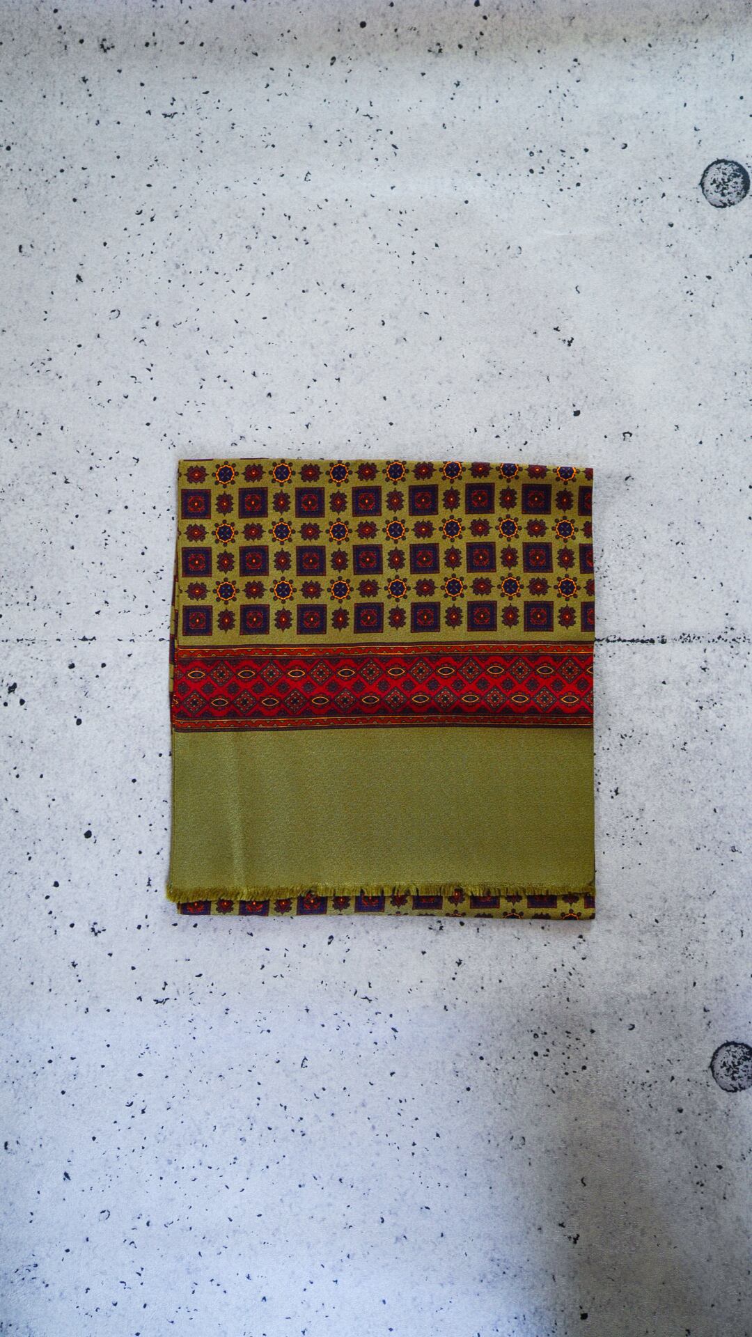 深みのあるオリーブに幾何学的なパターンが組み合わされた、大人の渋さを感じさせる一枚。