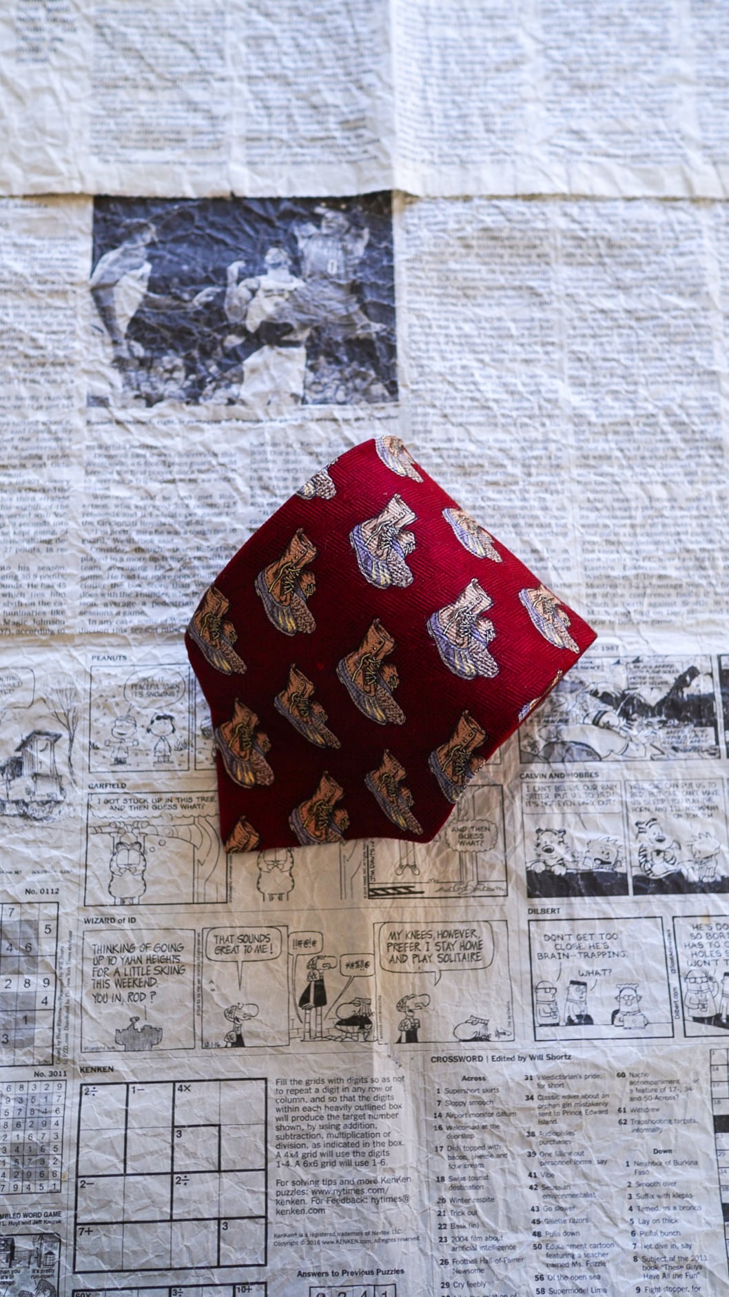 シルク100%の光沢がある生地で作られたビーンブーツ柄がプリントされているデザインで、ベースカラーはバーガンディになります。