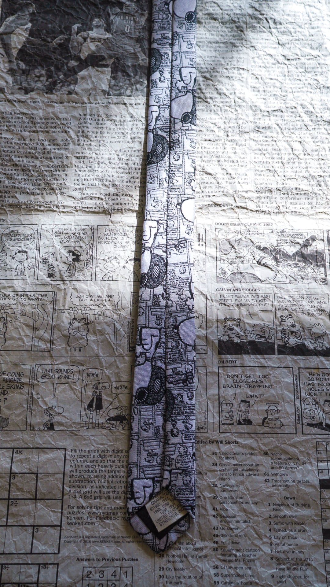 背景には、コミック調のコマ割りデザインが描かれており、ネクタイ全体にストーリーが広がっているかのようなユニークな仕上がりです。
