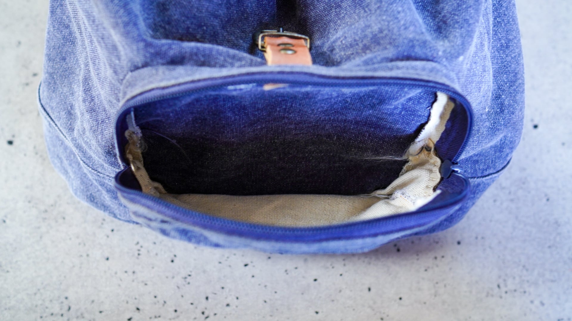 バッグ前面にはジッパー付きポケットが配置され、開口部はレザーストラップとドローコードの二重構造。