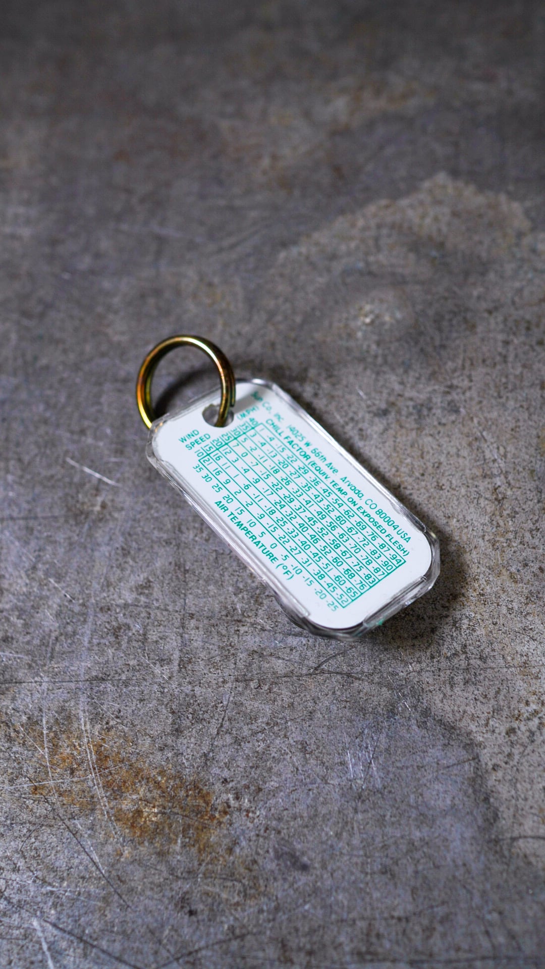 表面には温度計とコンパス、裏面には風速と気温から体感温度を算出するウインドチルチャートを備えています。