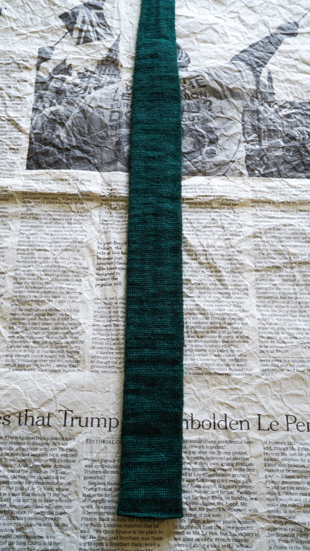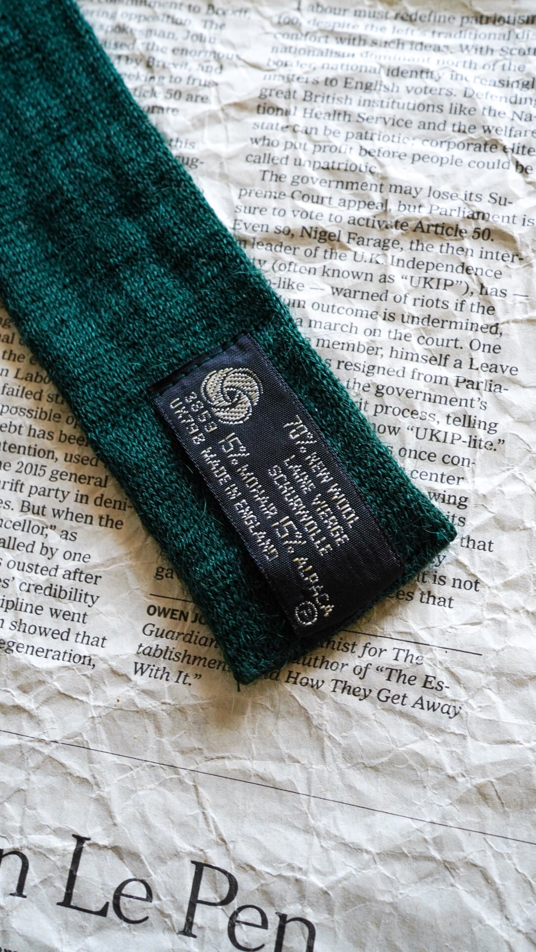 ウール70%、モヘア15%、アルパカ15%の生地で作られたスクエアエンドのニットタイで、シルクとは異なる温かみのある素材感のネクタイです。