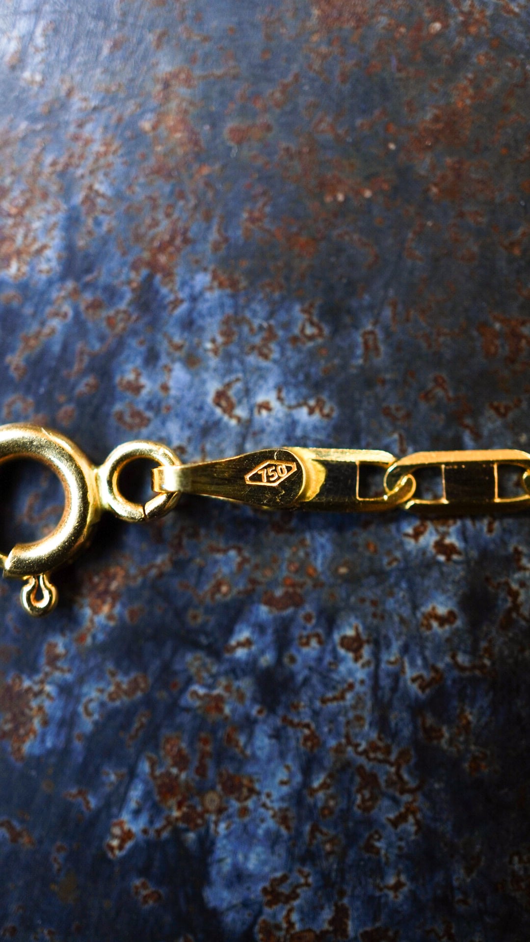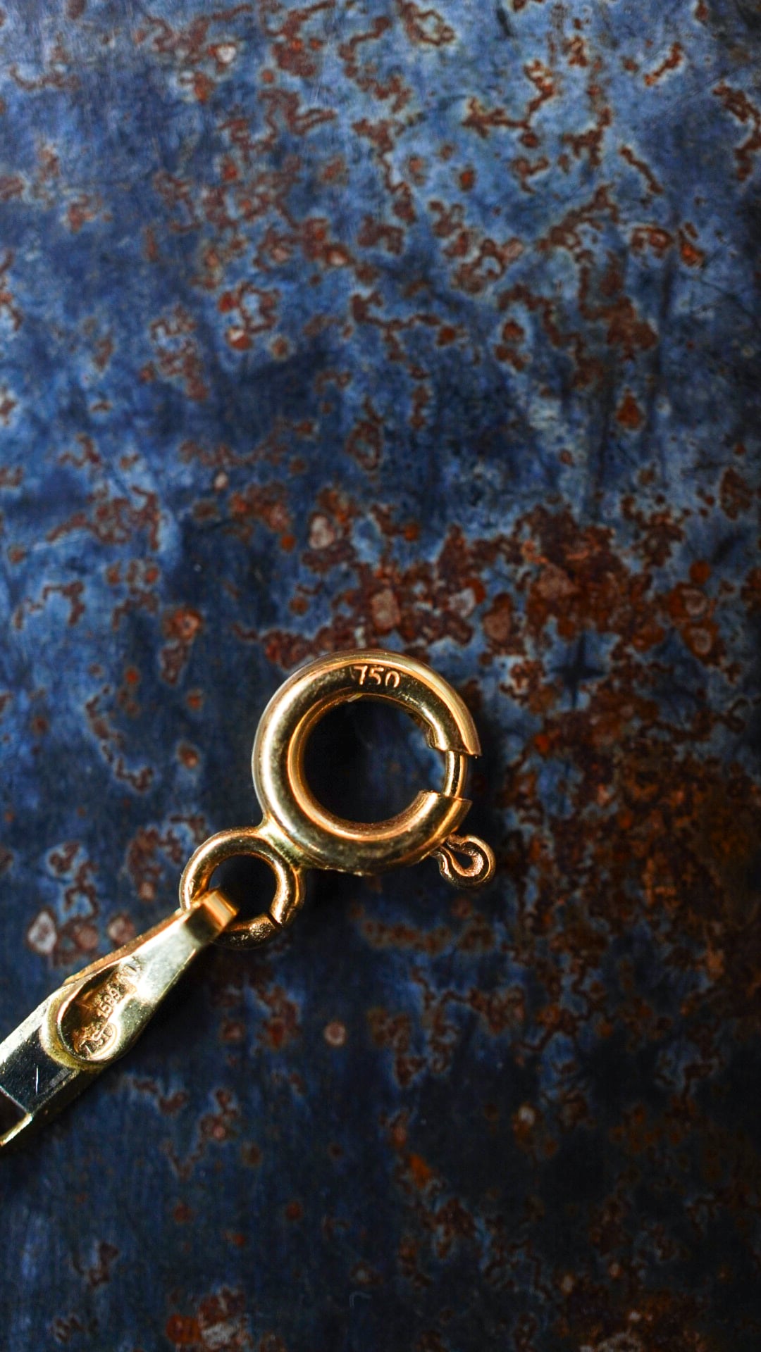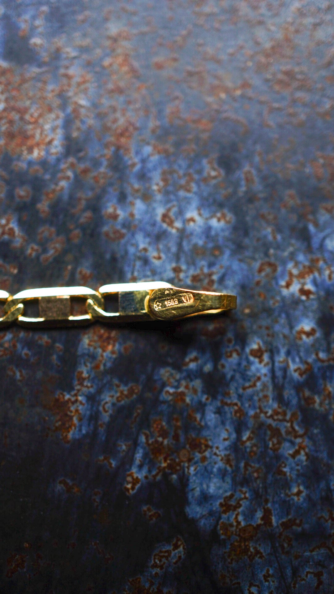 留め具およびエンドリンク部分には「750」の刻印の他に、「☆(イタリア共通マーク)」「1589(製造メーカー)」「VI(生産地域 / VICENZA)」のイタリアの刻印(ホールマーク)が入ります。