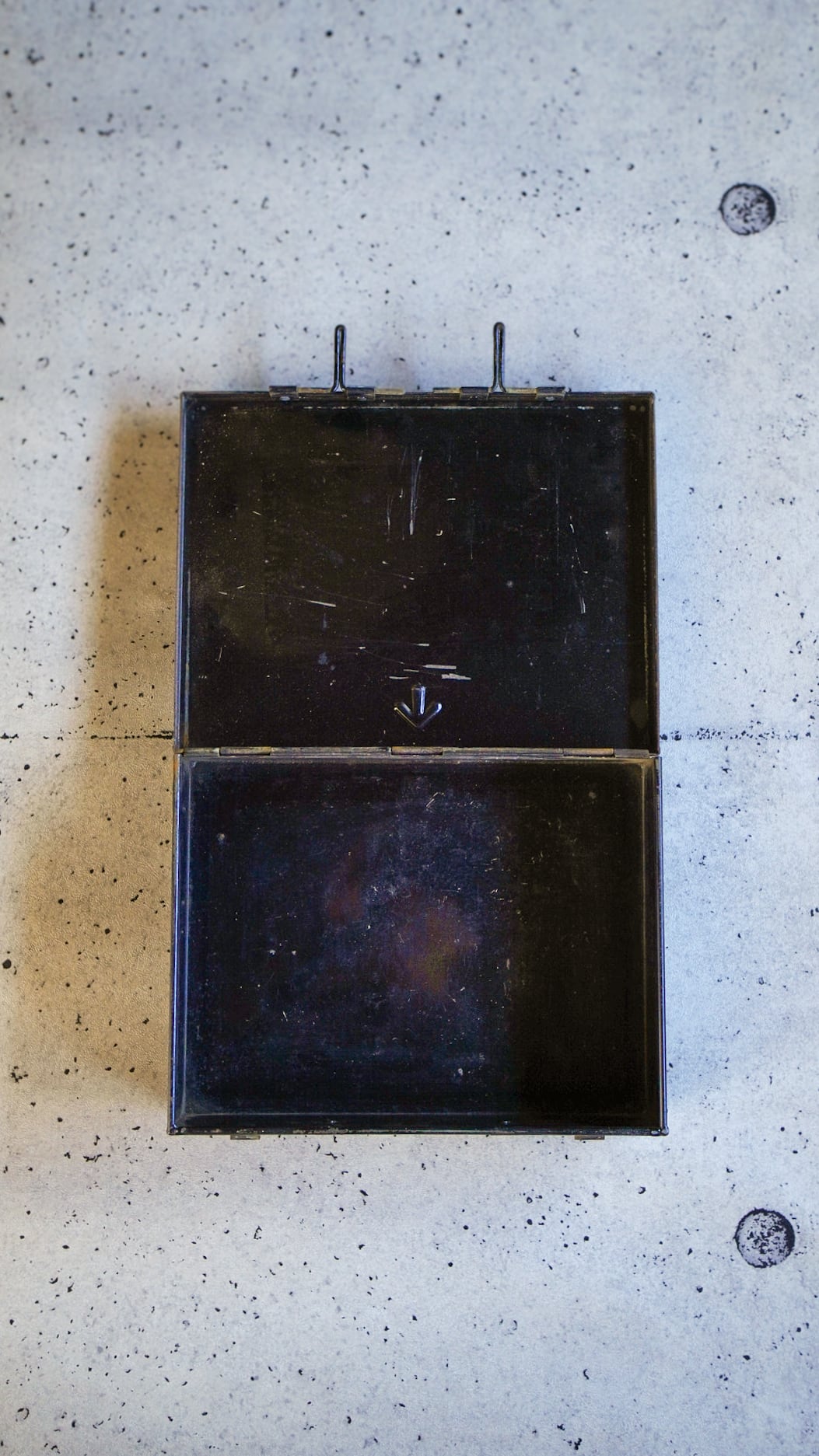 ブラックメタルの重厚な質感が印象的で、ミリタリーらしい無骨さとインダストリアルな佇まいが際立つヴィンテージボックス。