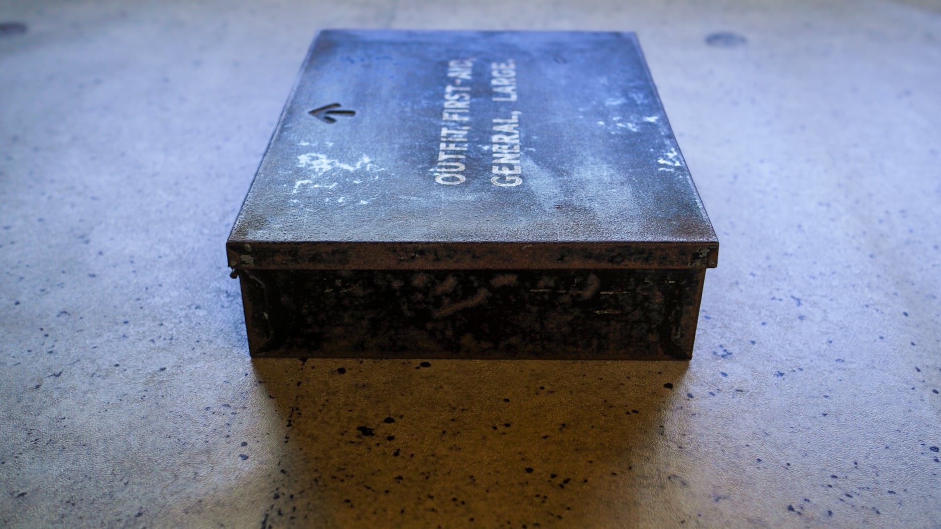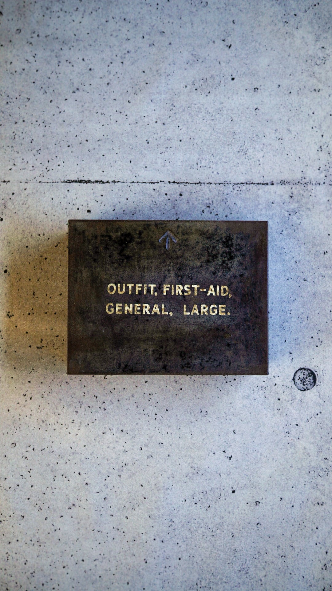 蓋の表面には白文字で「OUTFIT, FIRST-AID GENERAL, LARGE」とステンシルが入り、その上にはイギリス官給品を示すブロードアローのエンボスが刻まれています。