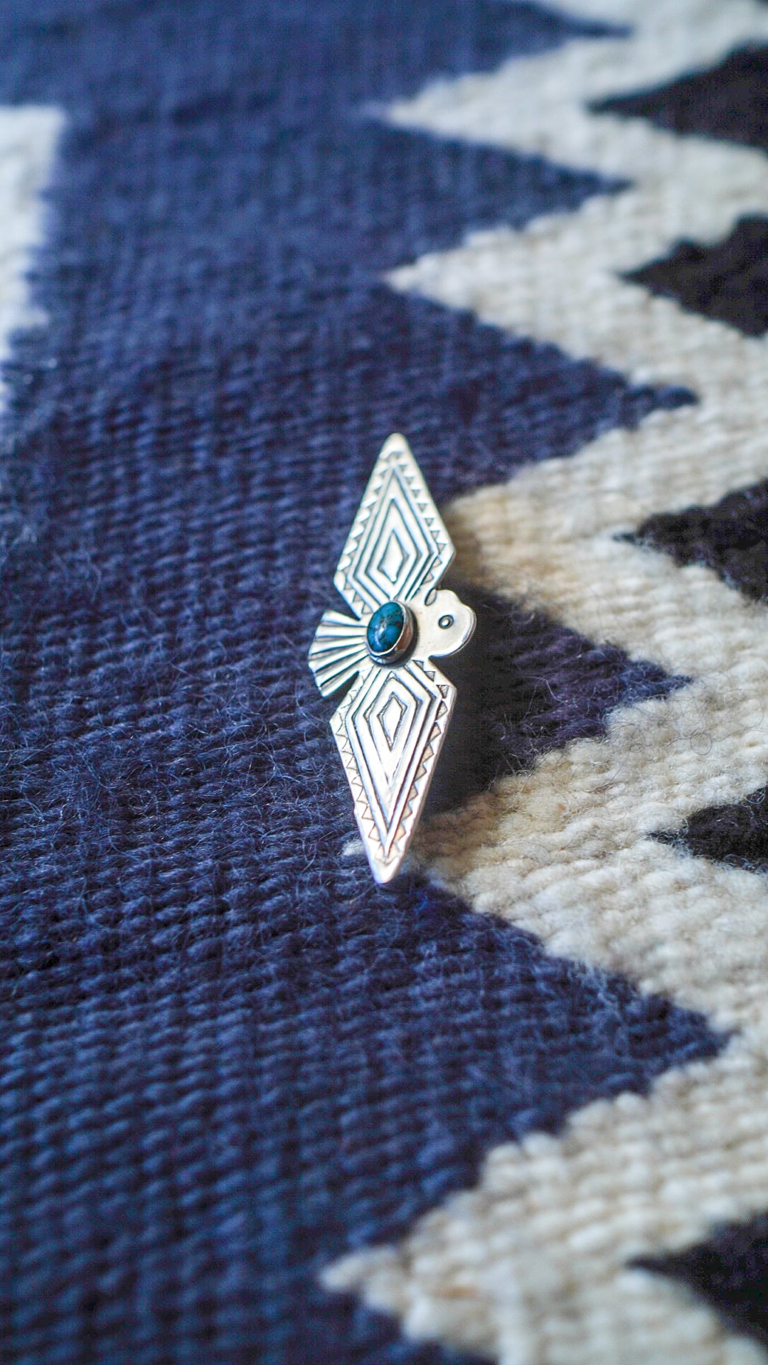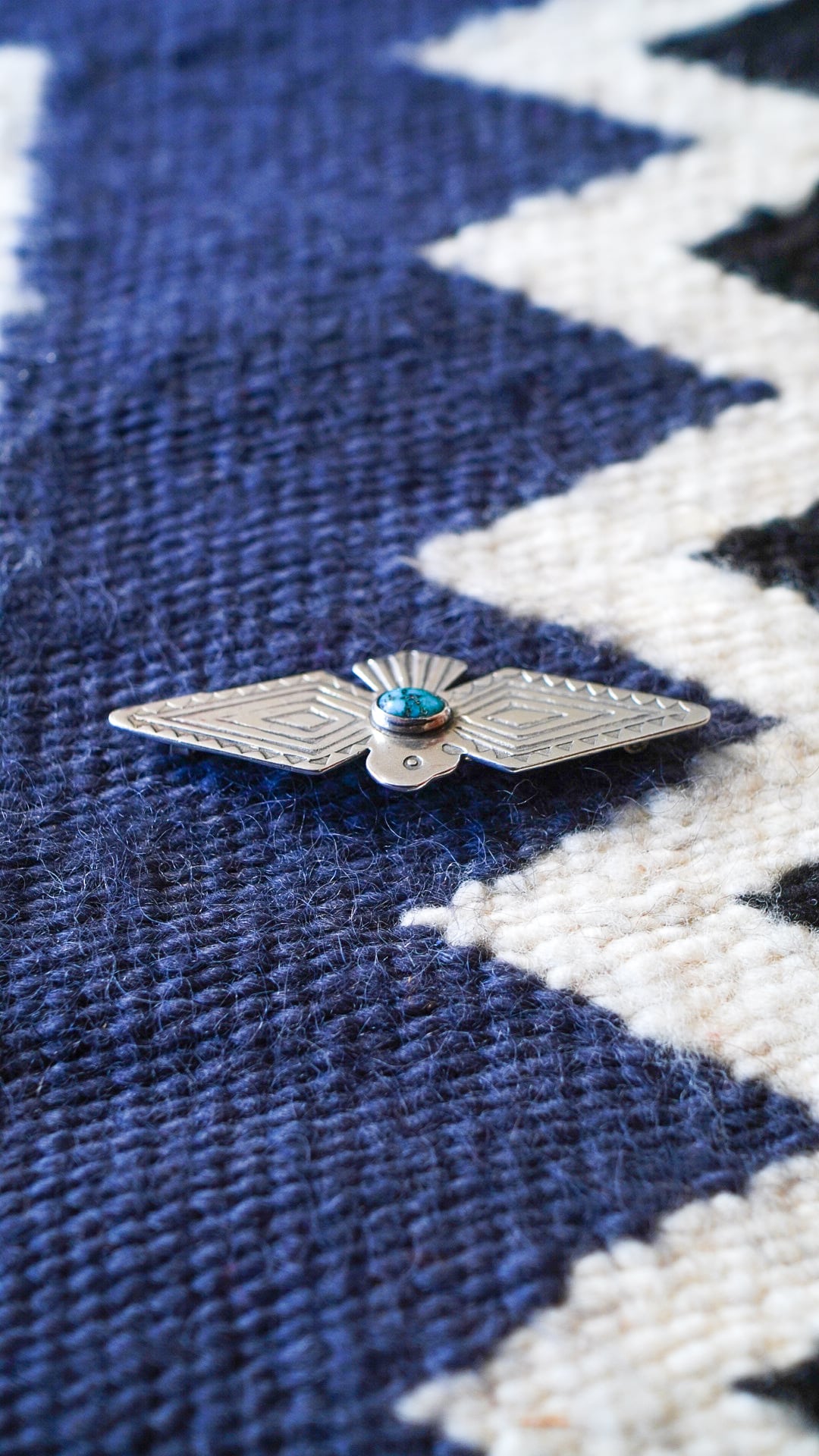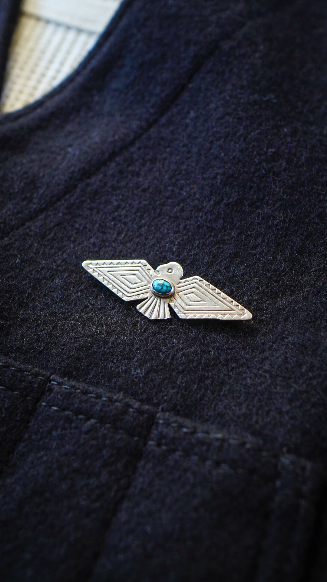 本ピンは、「幸福をもたらす鳥」を意味する伝説上の鳥サンダーバードをかたどったシルエットで、中央には楕円形の美しいターコイズがあしらわれています。