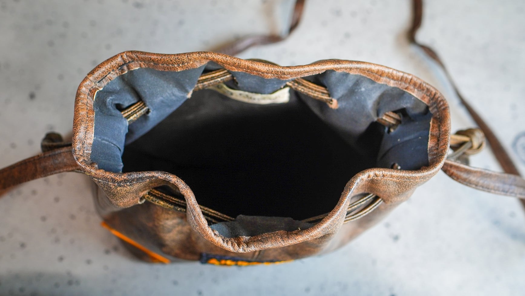 バッグの開口部はドローストリング仕様で、レザーコードを絞って閉じる構造。
