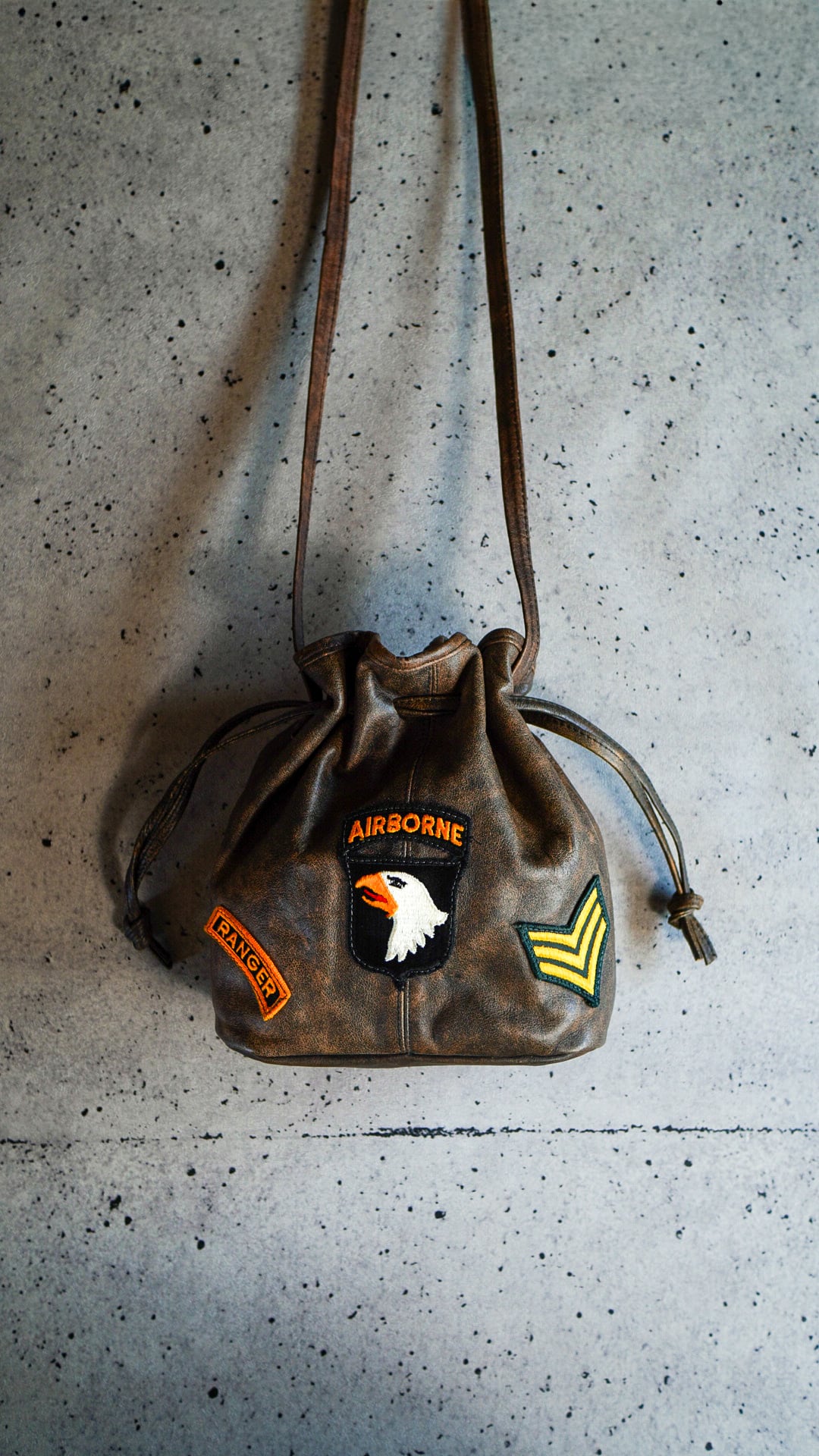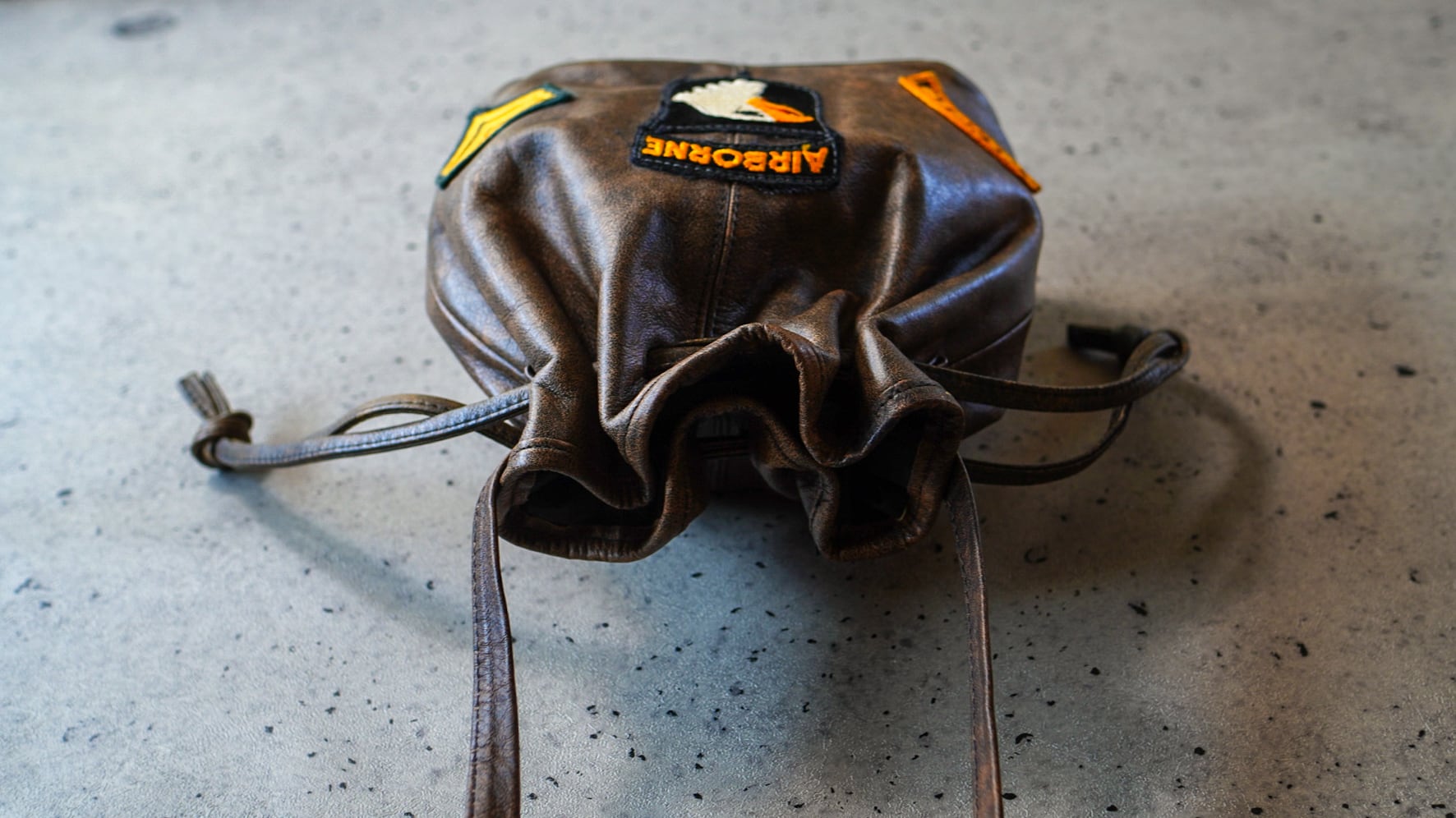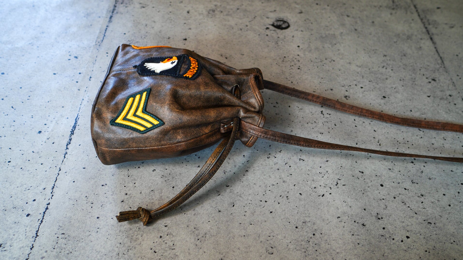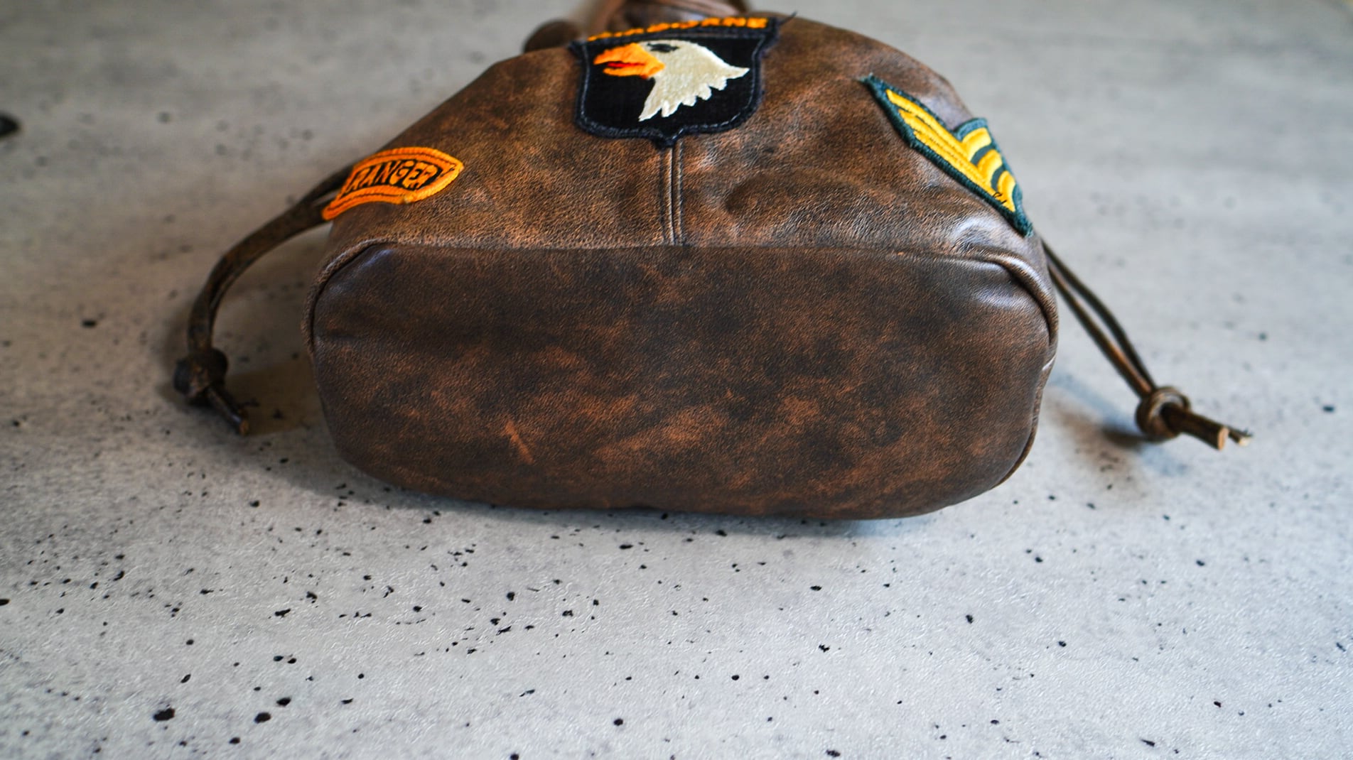 L.J. Simone U.S. Military Patch Leather Drawstring Bag