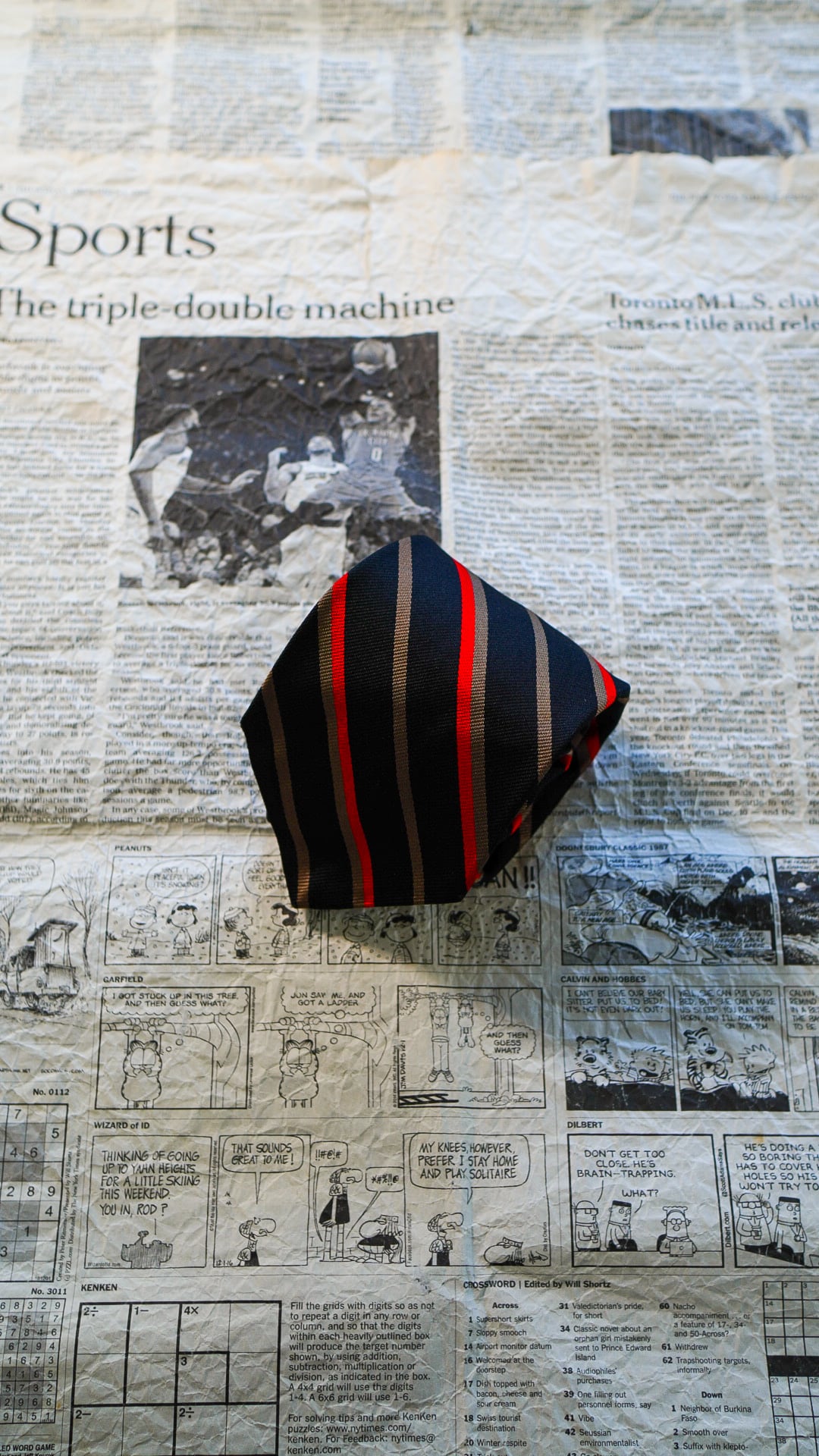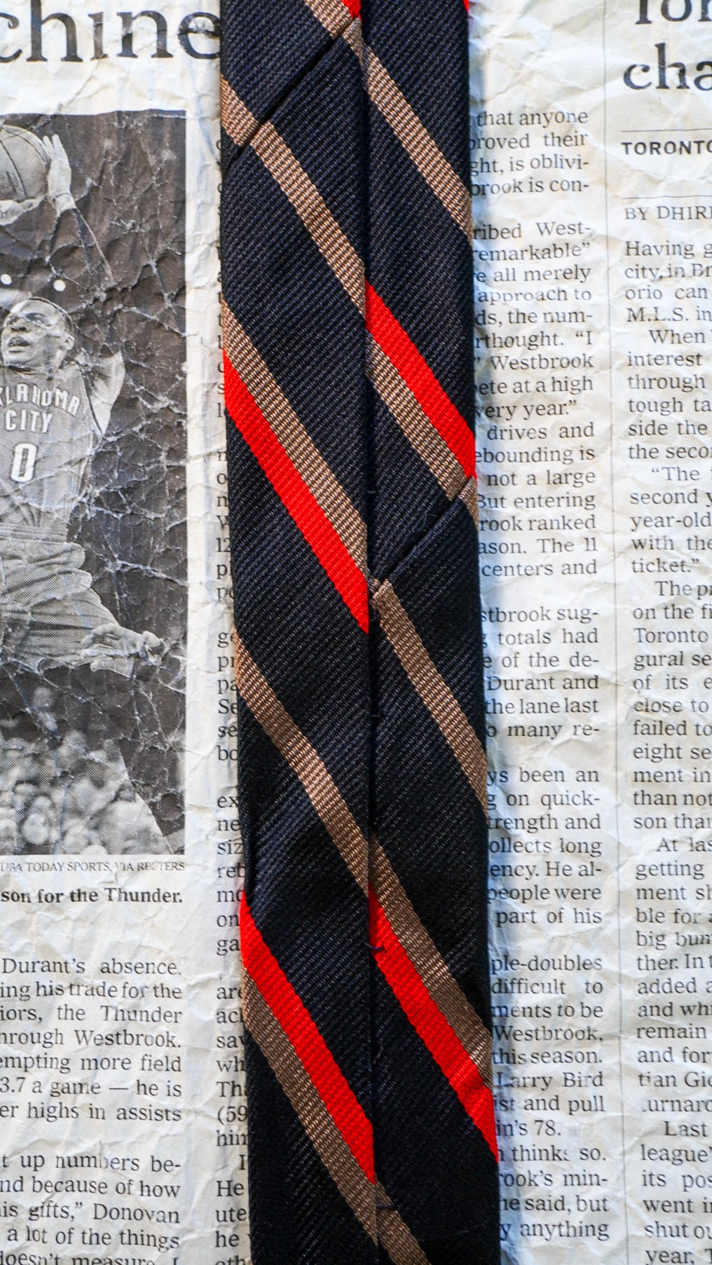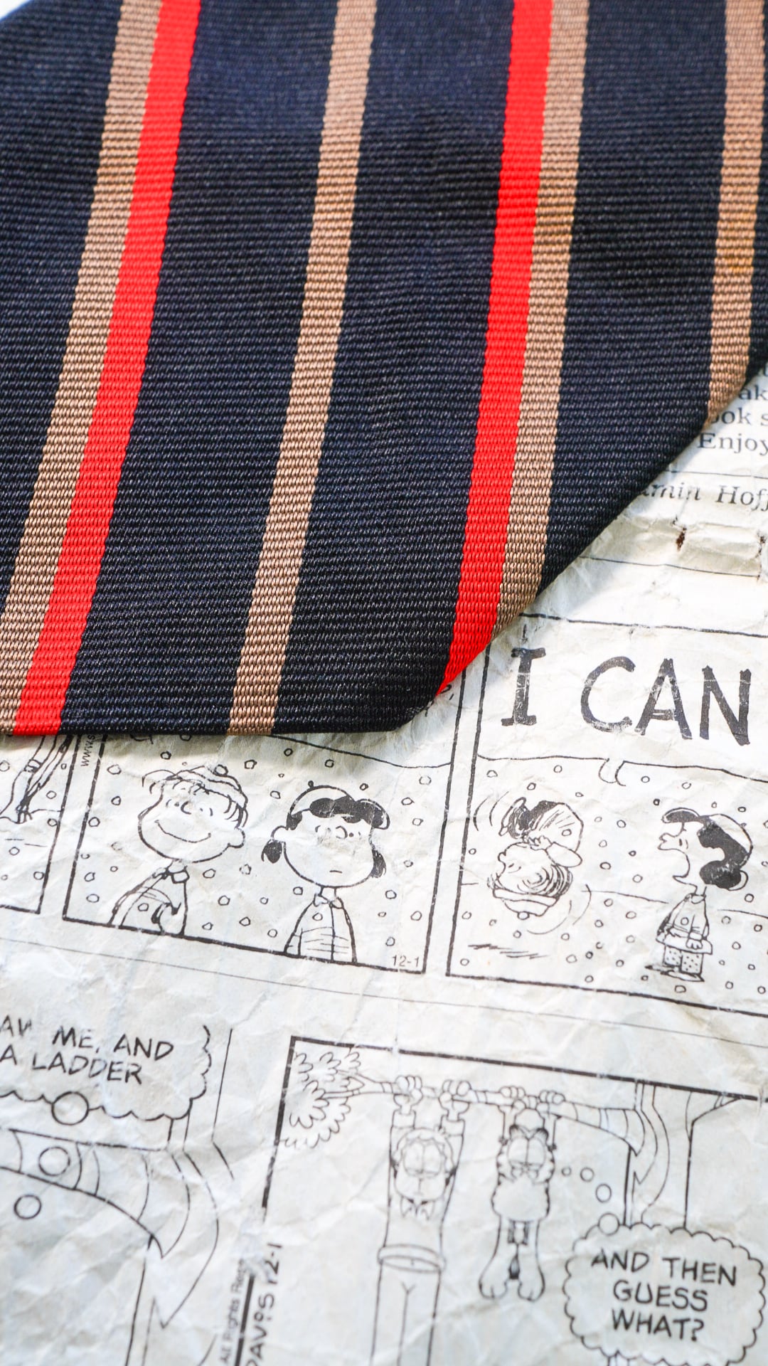 シルク混の光沢がある生地で作られた定番のレジメンタルストライプ柄のネクタイで、カラーはブラック×ゴールド×レッドの配色になります。