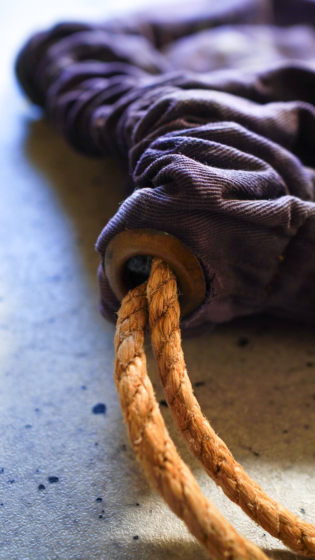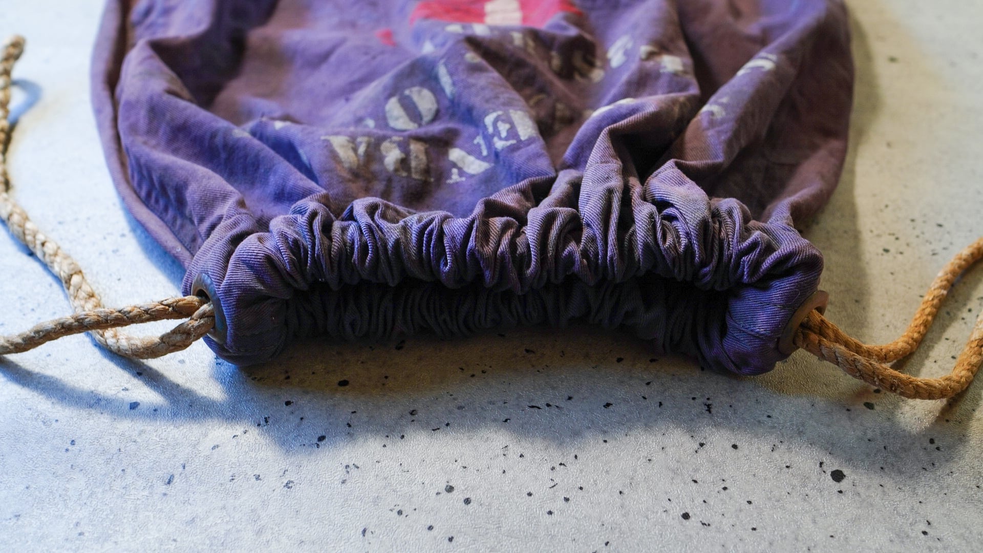 普通に持ち手の紐を巾着のように持つとバッグが地面に着いてしまいますので、持ち手の紐を使って背中で担ぐように持つか、もしくは、持ち手の紐を使わずバッグ入口の下部分を直接手で持つのがオススメです。