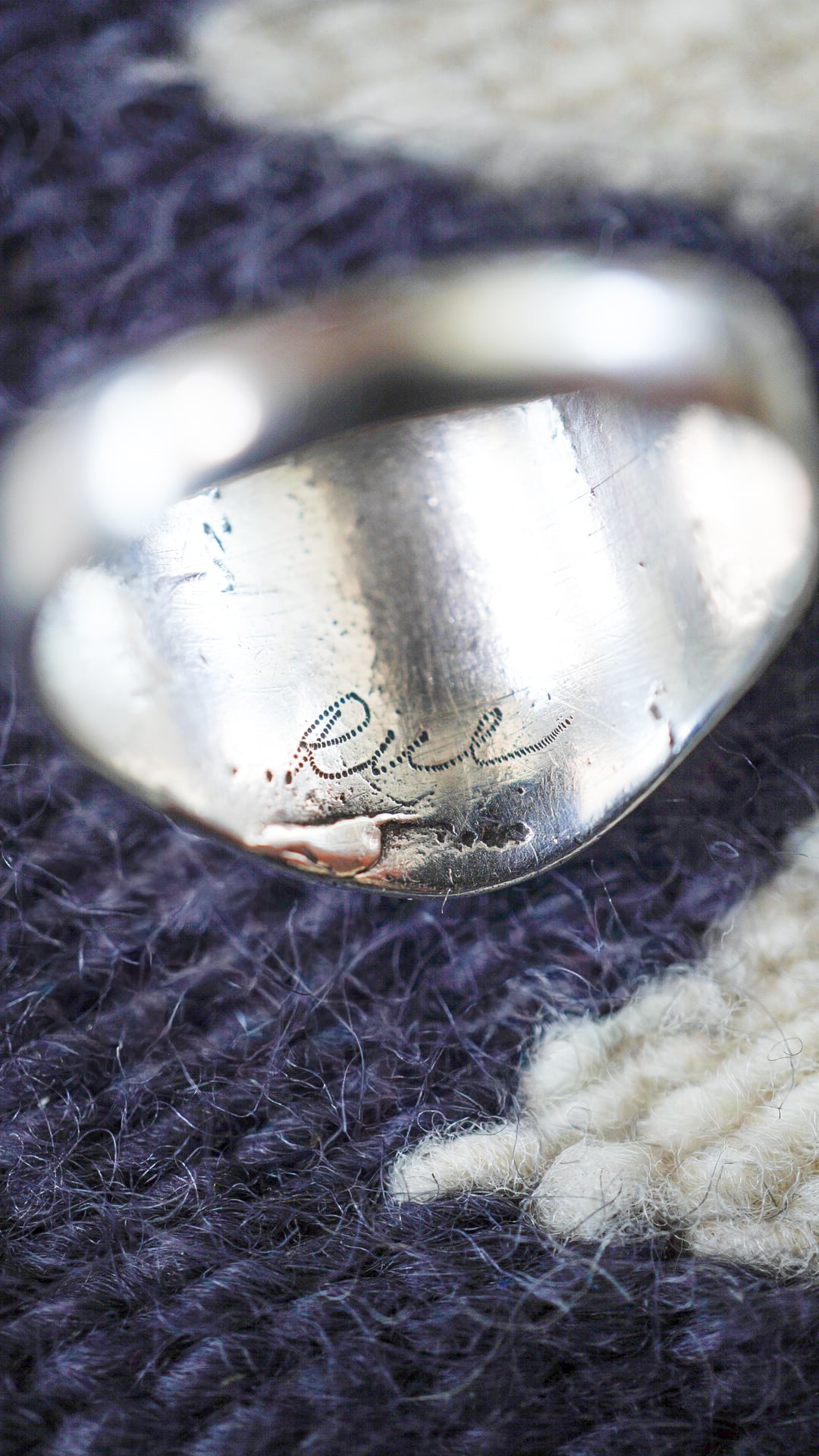 リングの裏側には「Rue」と読める刻印が確認でき、作家によるサインあるいは当時の所有者名を示すものと考えられます。