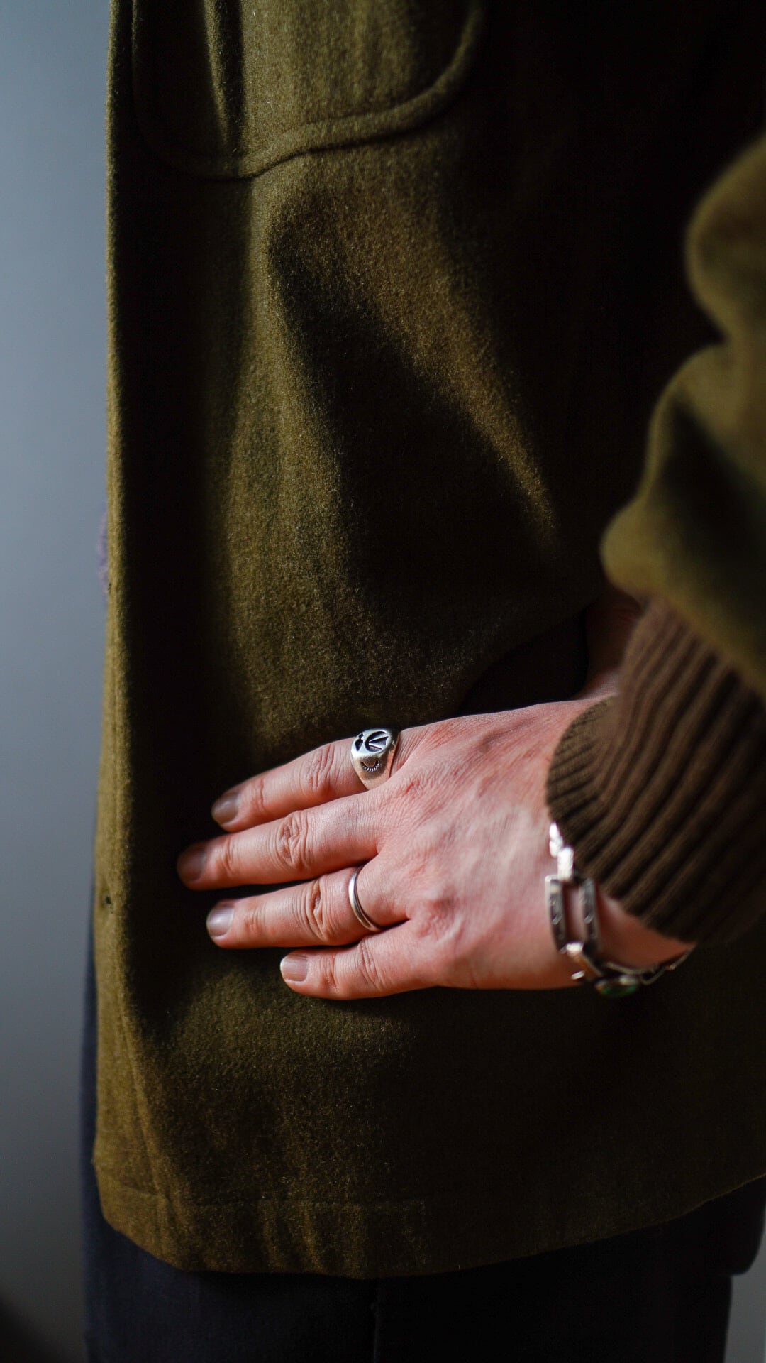 本リングはシグネットリングを思わせる印台型のフォルムが特徴的で、リングトップには「幸福をもたらす鳥」を意味する伝説上の鳥サンダーバードのスタンプワークが施されています。