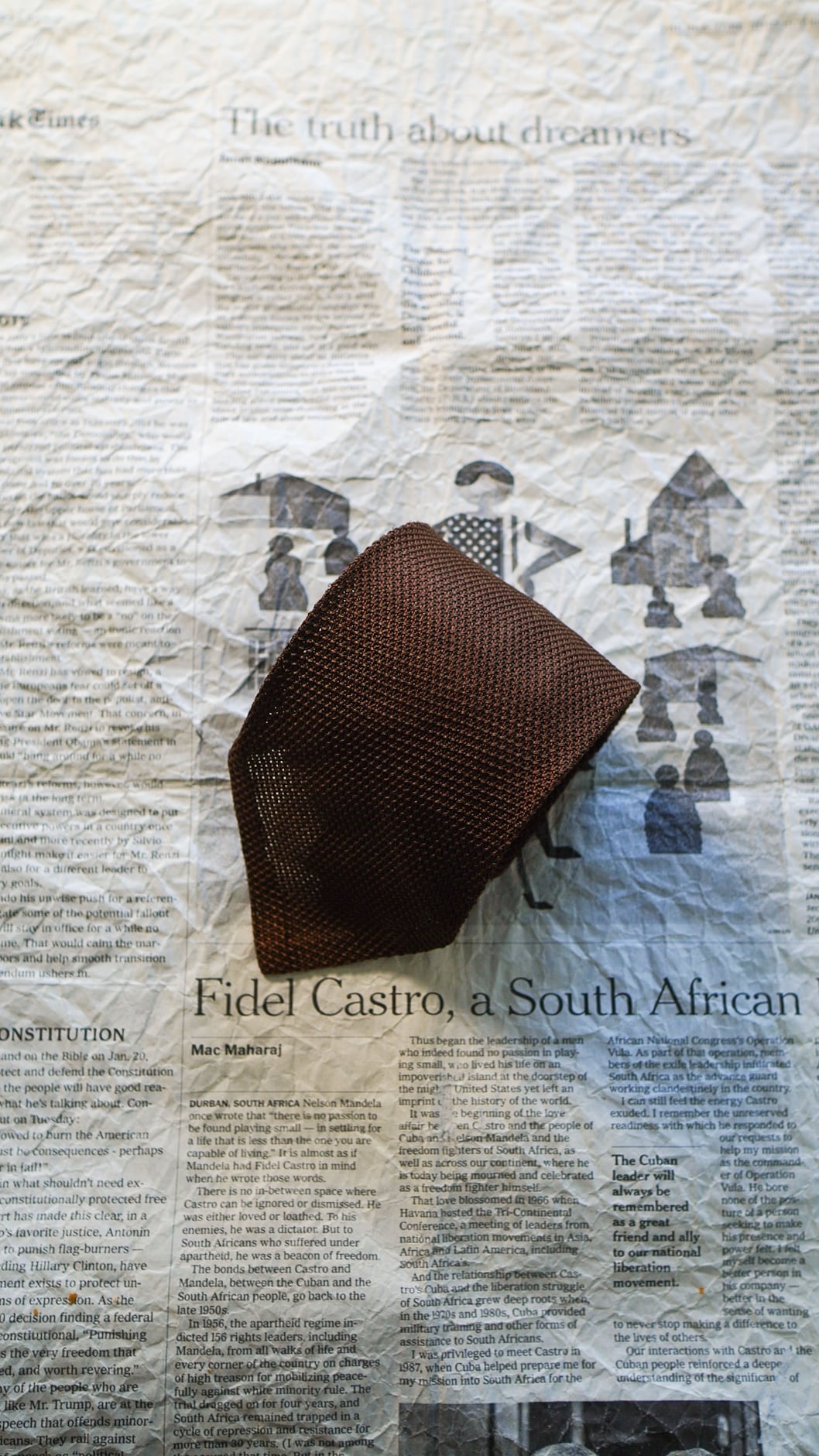 イタリアで織られたシルク素材を使用した一本で、カラーはブラウン。