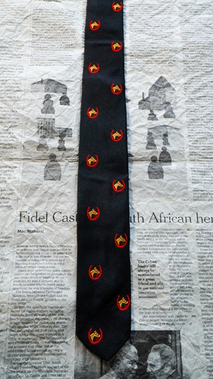 シルク混(シルク65%、ポリエステル35%)の光沢がある生地で作られたホースシュー&ホースヘッド柄のネクタイで、ベースカラーはダークネイビーになります。