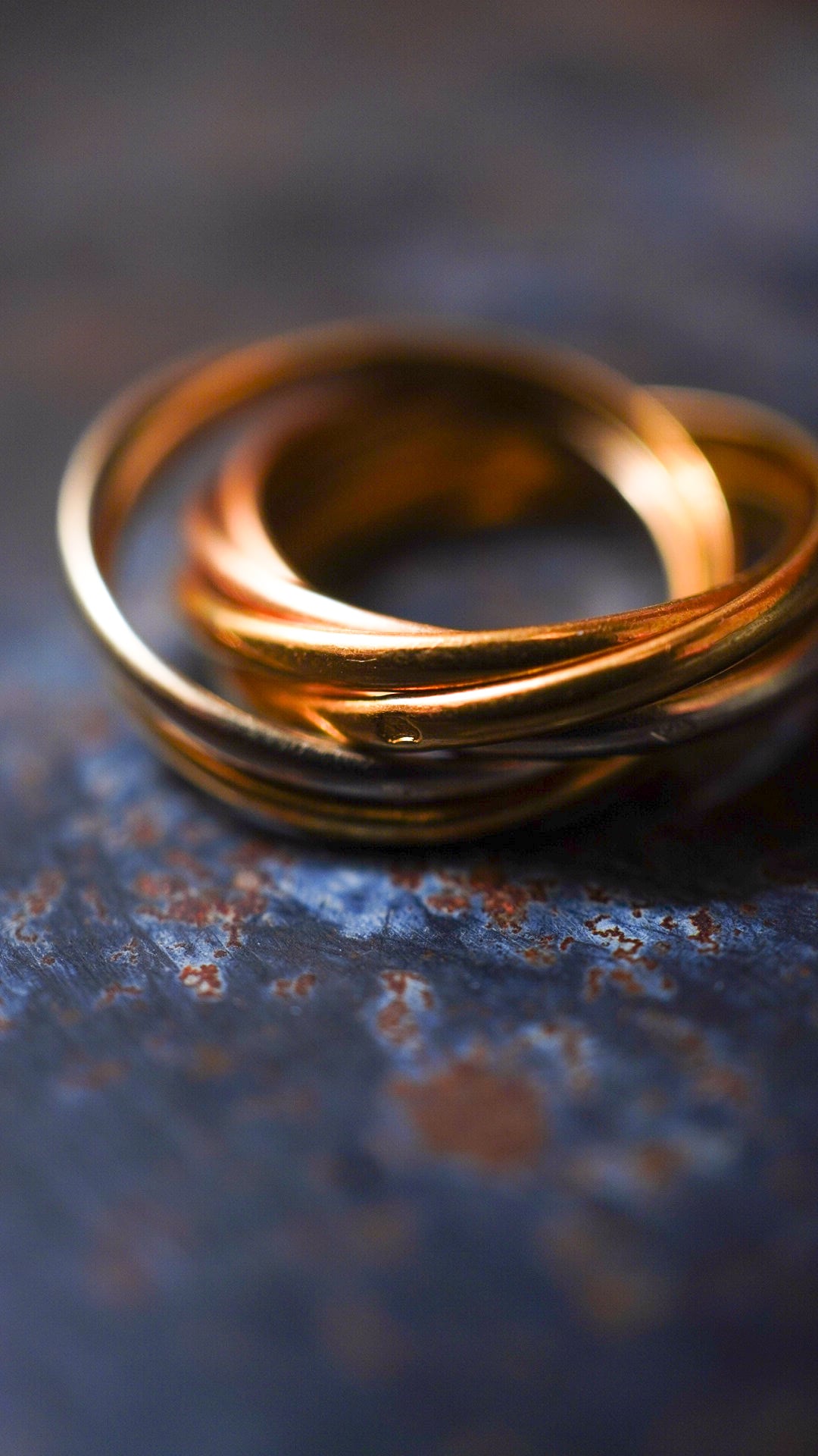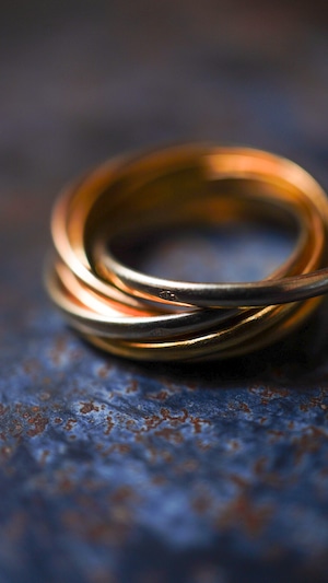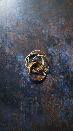 3色が重なり合うトリニティの意匠を7本の細身リングで構成したデザインです。