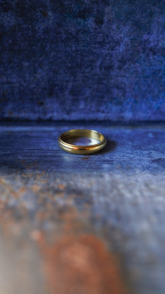 両端をしっかりと厚みのあるイエローゴールドで縁取り、中央にコッパーを配したコンビデザインが特徴的で、異なる素材のコントラストを活かした当時としても独自性の高い仕上がりとなっています。