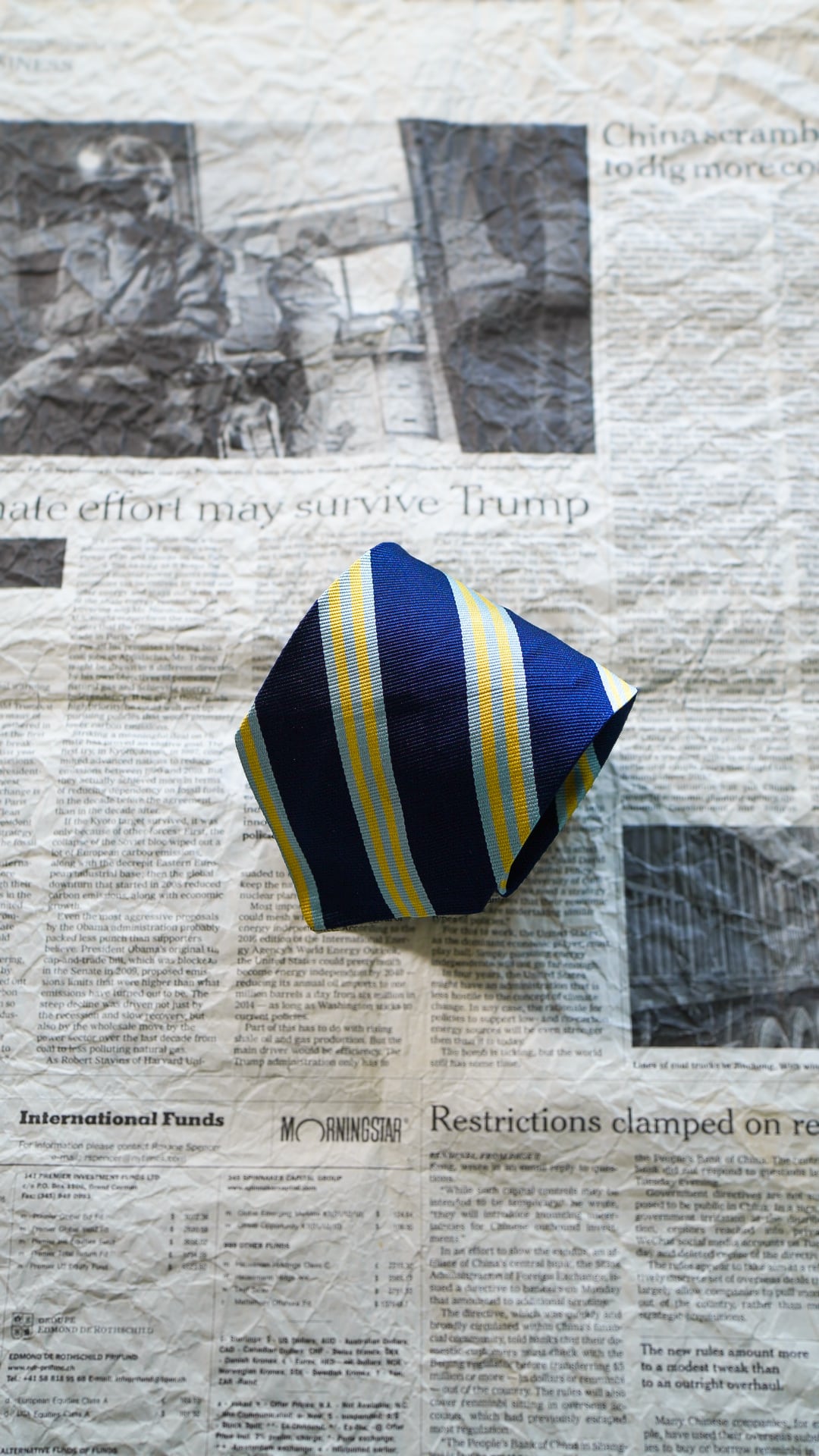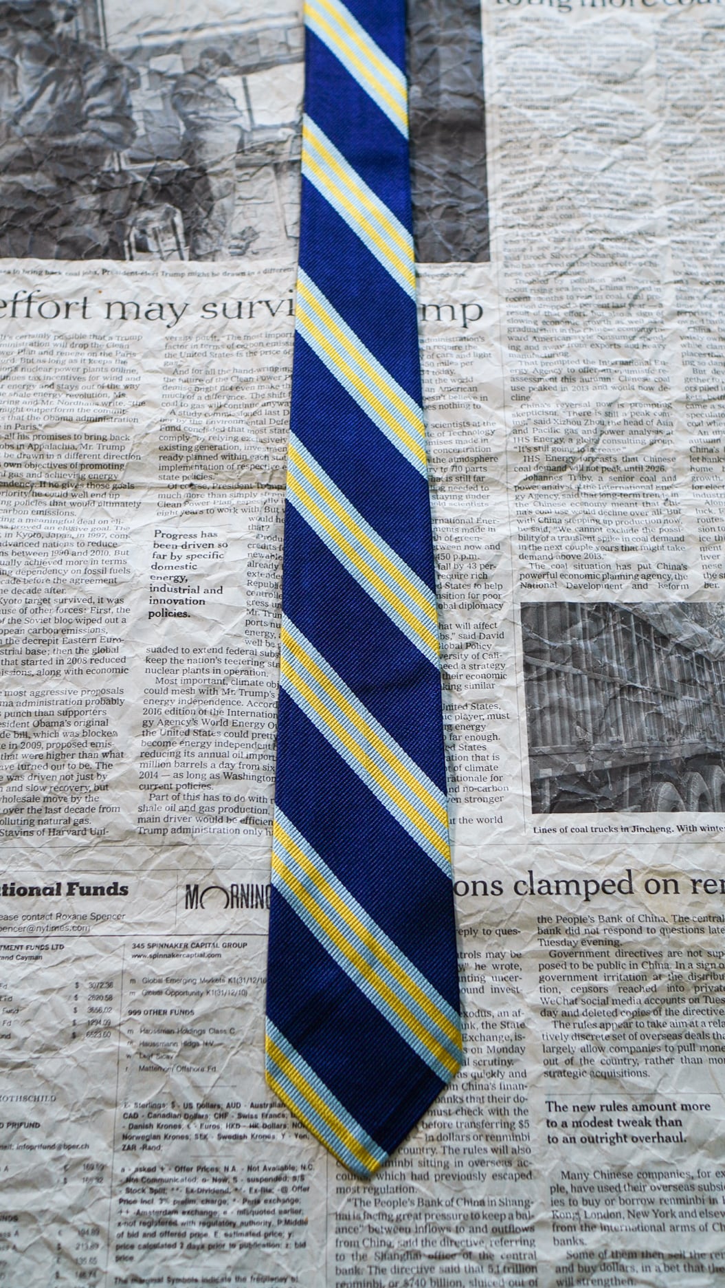 シルク100%の光沢がある生地で作られた定番のレジメンタルストライプ柄のネクタイで、カラーはネイビー×ライトブルー×イエローがかったライトゴールドの配色になります。