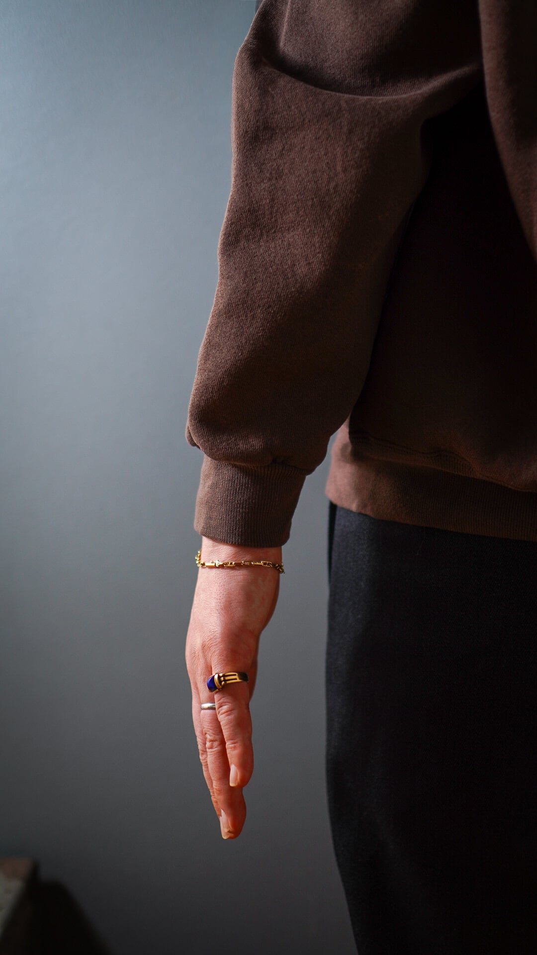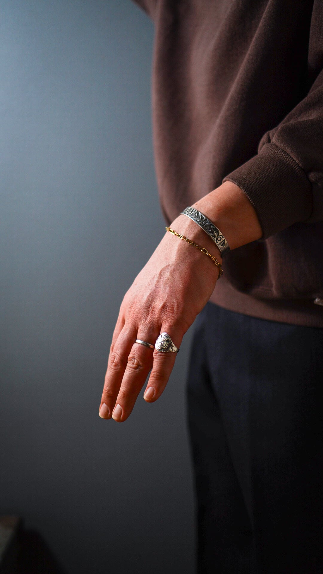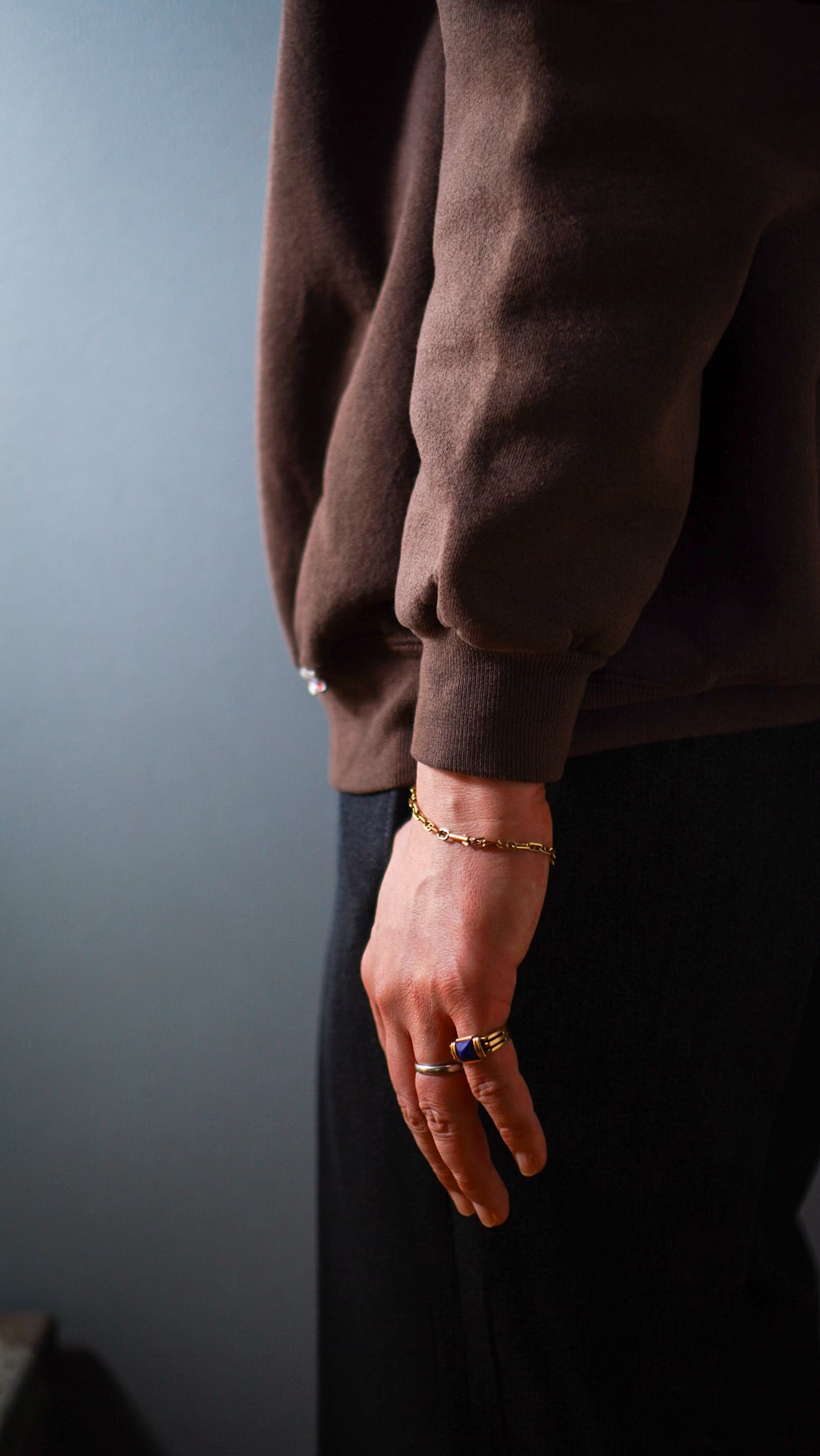 手元に控えめながらも上品な輝きを宿す大人のヴィンテージゴールドブレスレットで、さりげなく洗練された雰囲気をプラスするスタイリッシュな1本かと思います。