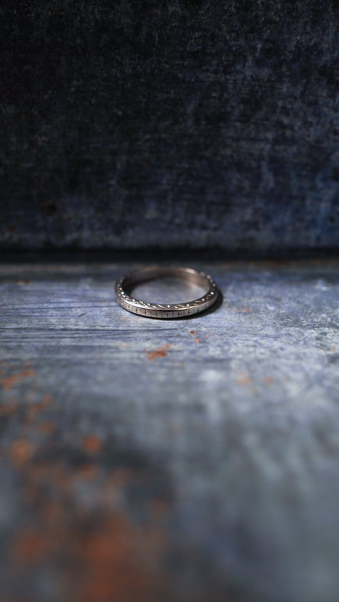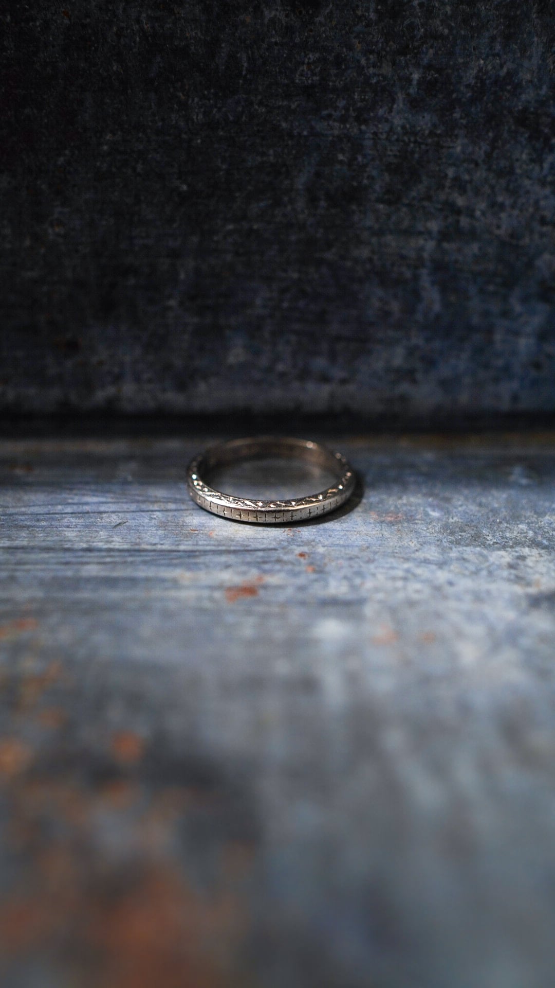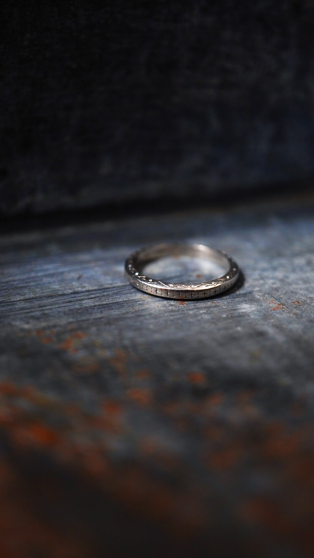 シンプルなバンドリングでありながら、細かな彫り装飾によってさりげない存在感を放つ一品です。