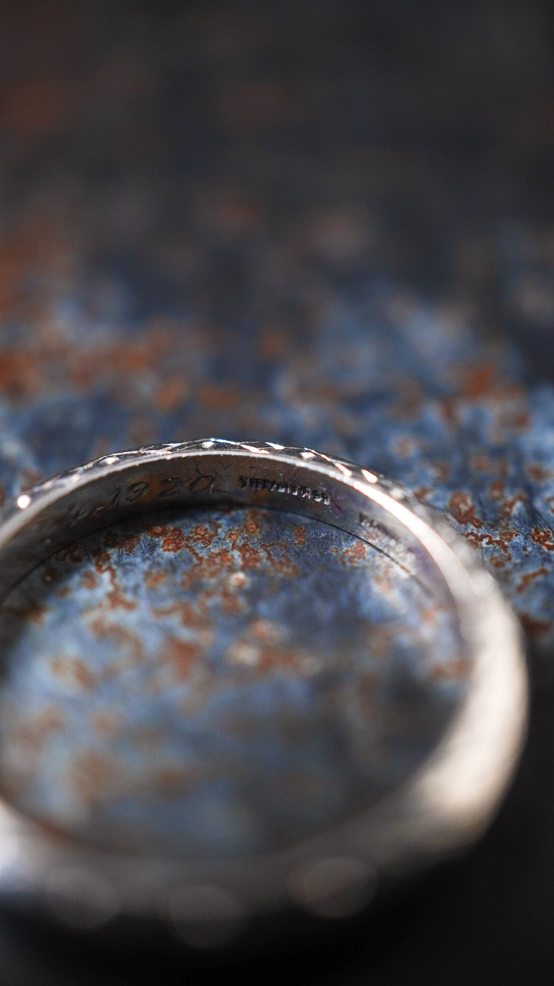 リングの内側には、「TIFFANY & CO」「PLATINUM」「November 24, 1920」等の刻印が入っています。