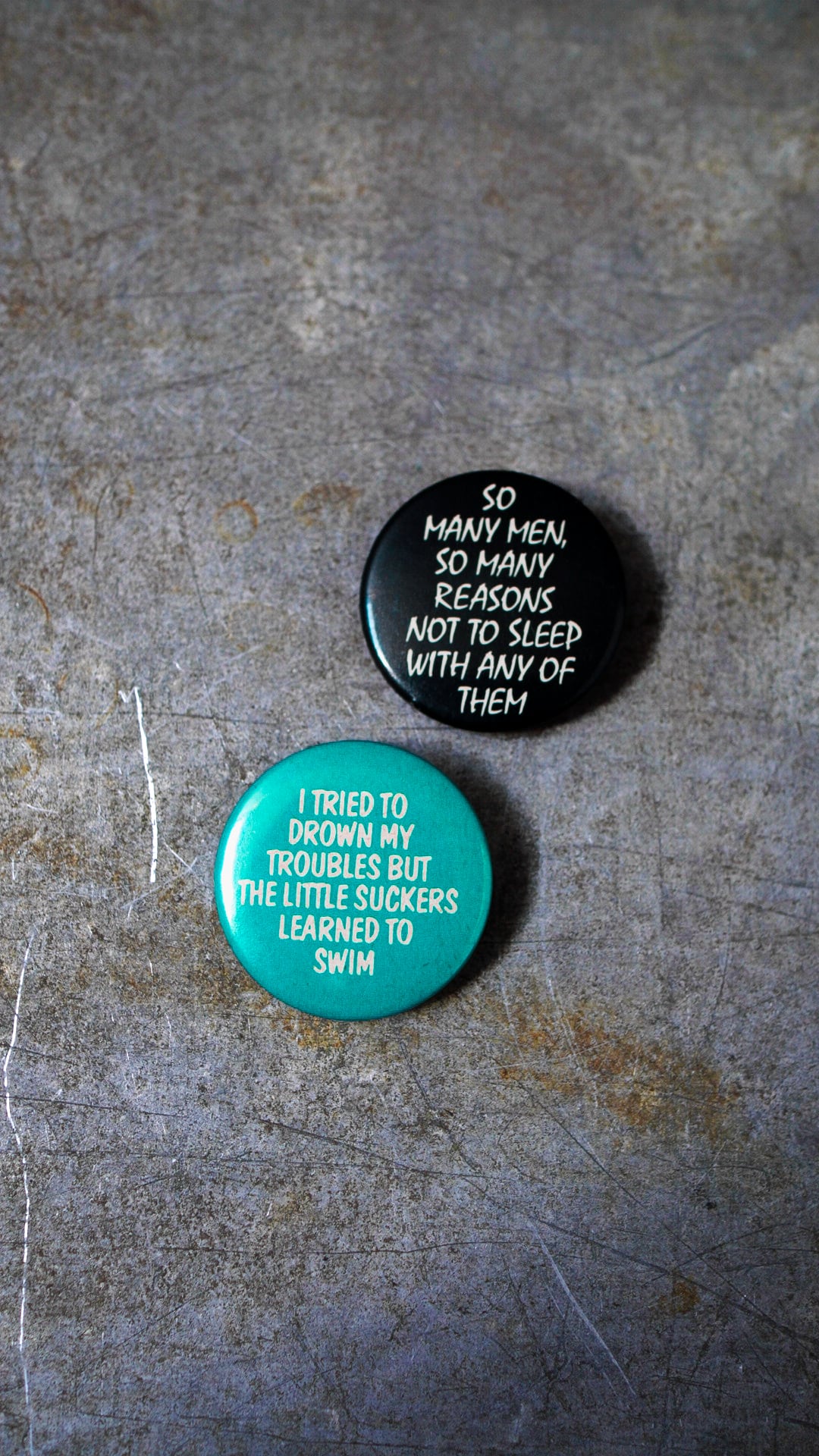 アメリカ雑貨の中でも人気が高く、ユニークなメッセージや配色が魅力のヴィンテージ缶バッジ。