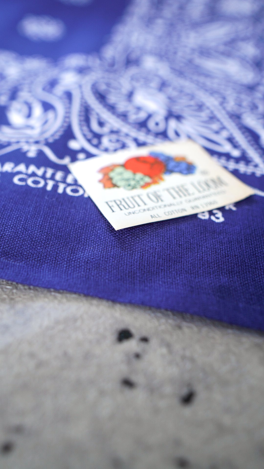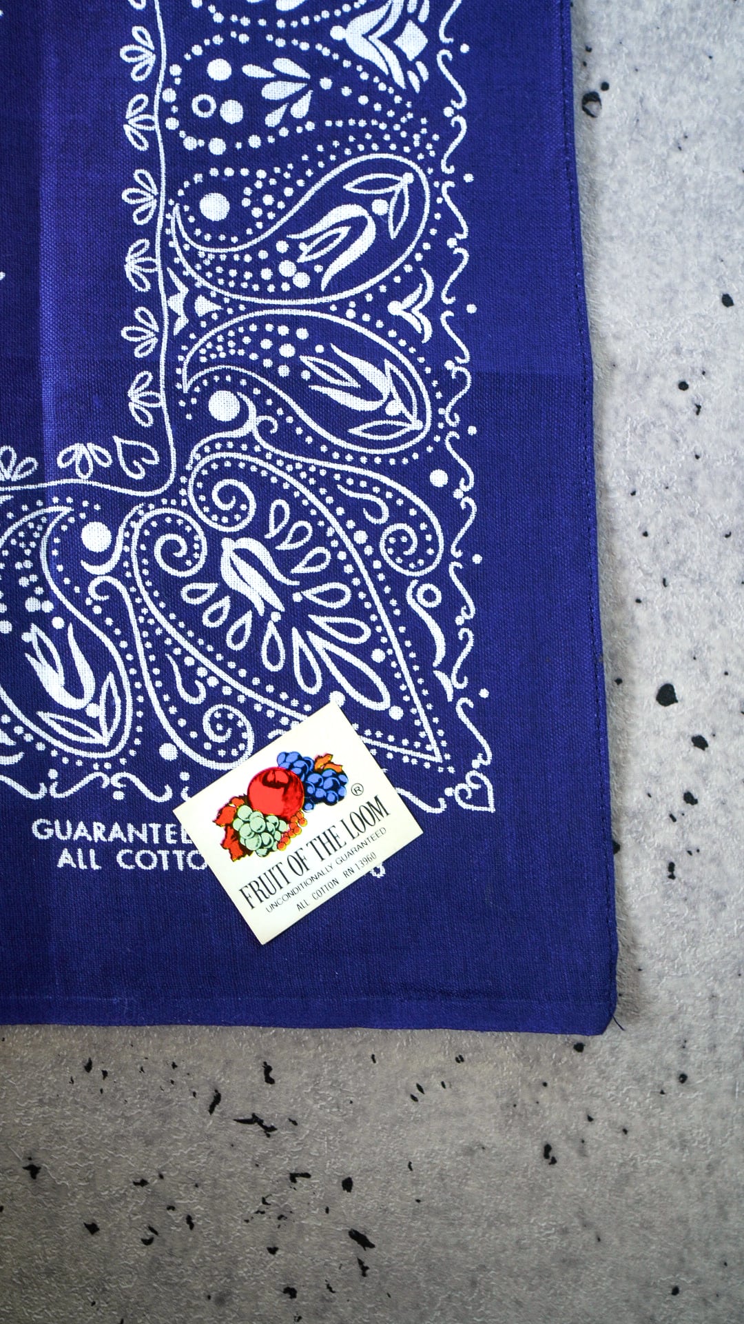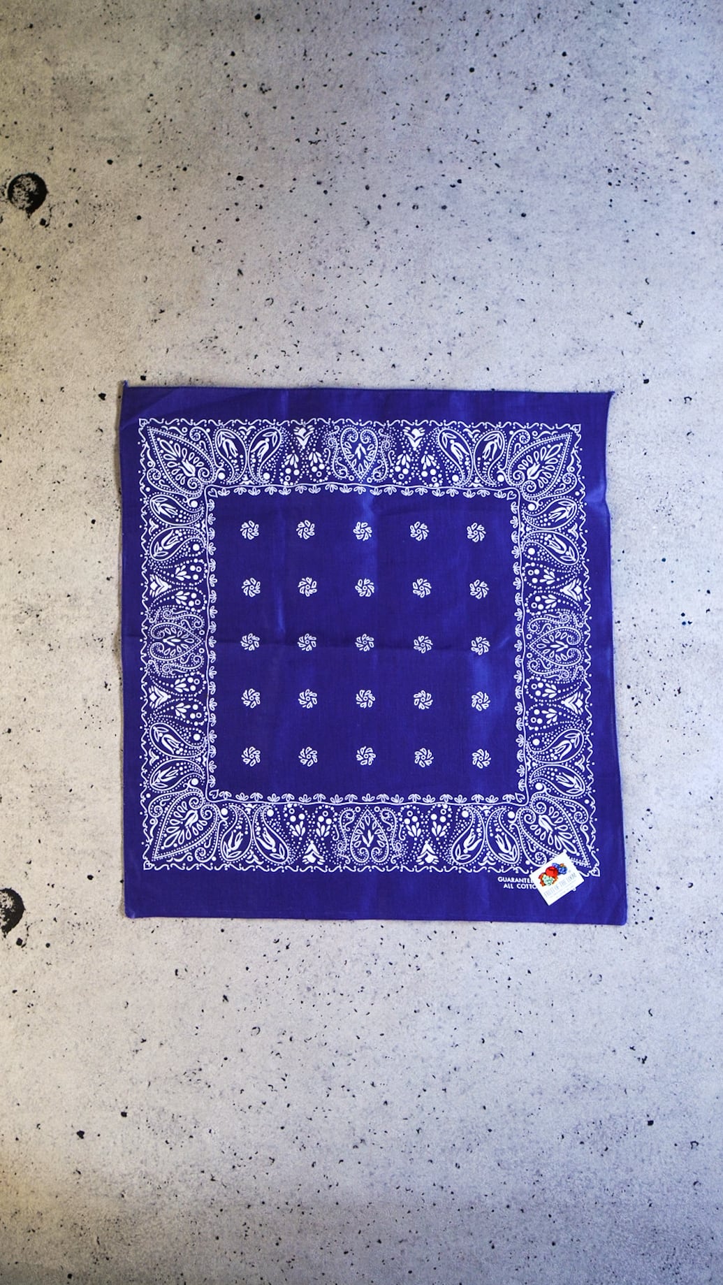 シール下のバンダナ本体には、「GUARANTEED FAST COLOR」「ALL COTTON」「RN 14193 (WAMCRAFT社)」の文字が表記されています。