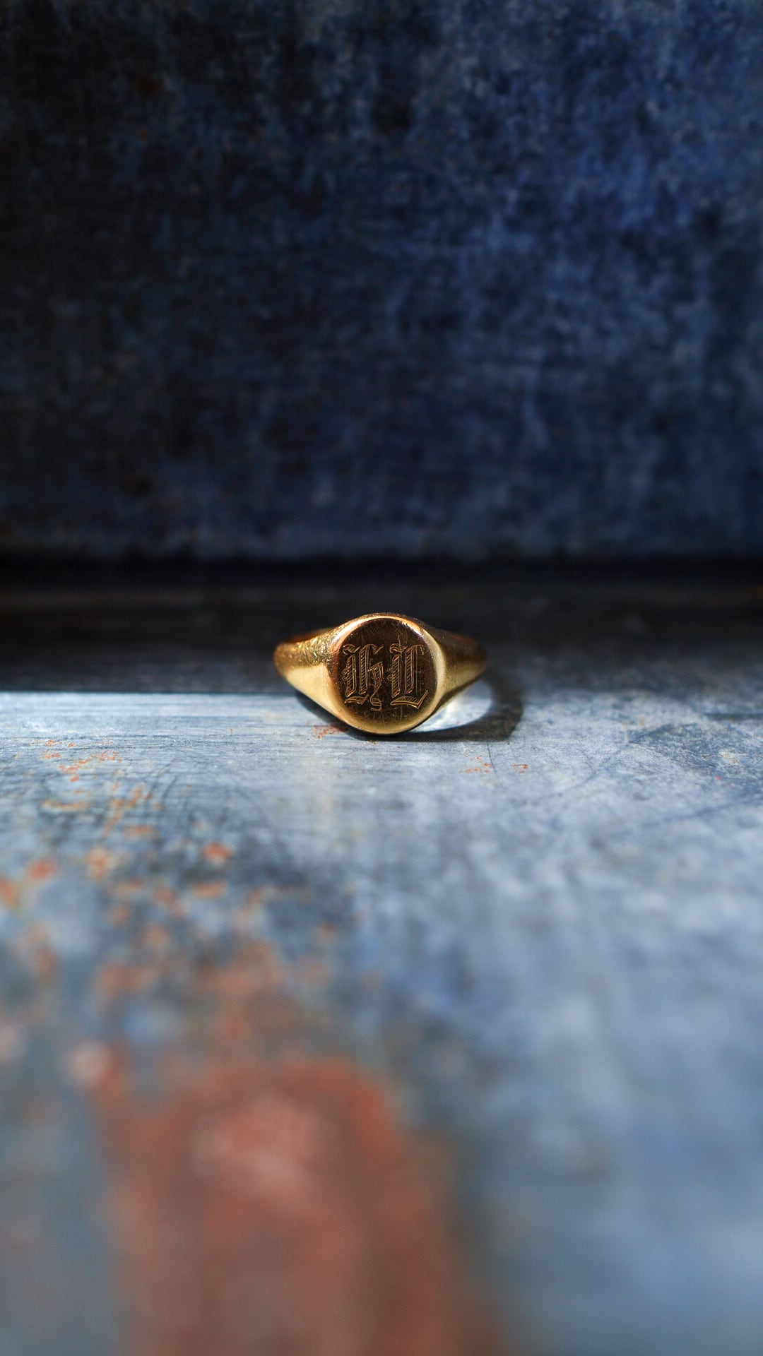 リングトップにはオールドイングリッシュでイニシャル"HL"が彫られており、クラシックなデザインに仕上がっています。