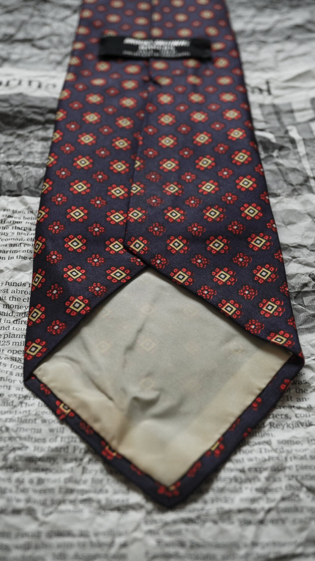 シルク100%の光沢がある生地で作られた小紋柄のネクタイで、カラーはダークネイビー×レッド×イエロー×ホワイトの配色になります。