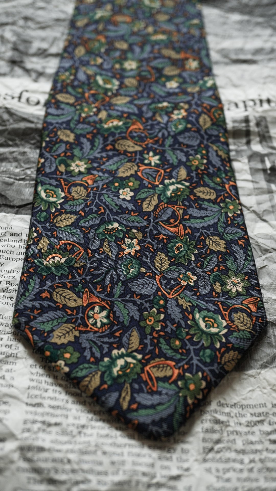 シルク100%の光沢がある生地で作られたボタニカル柄のネクタイで、ベースカラーはネイビーになります。