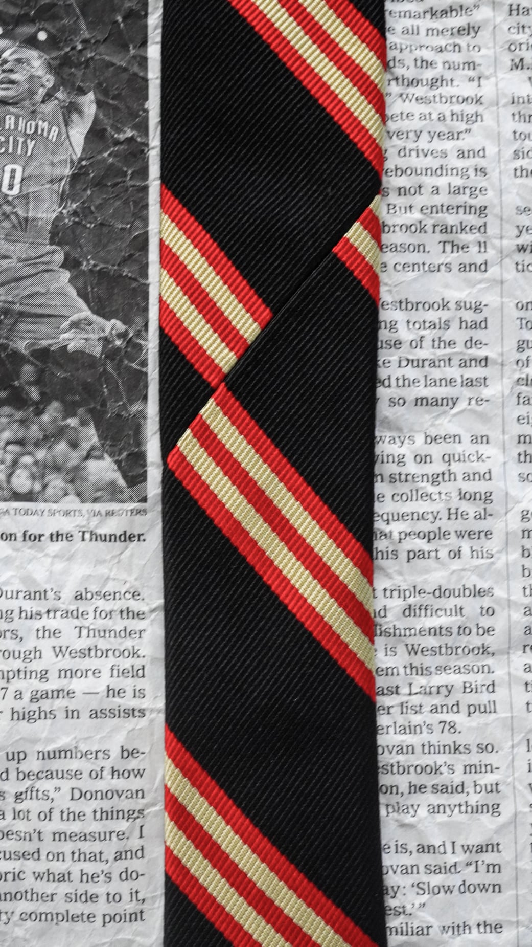 シルク混(シルク65%、ポリエステル35%)の光沢がある生地で作られた定番のレジメンタルストライプ柄のネクタイで、カラーはブラック×レッド×薄いゴールドの配色になります。
