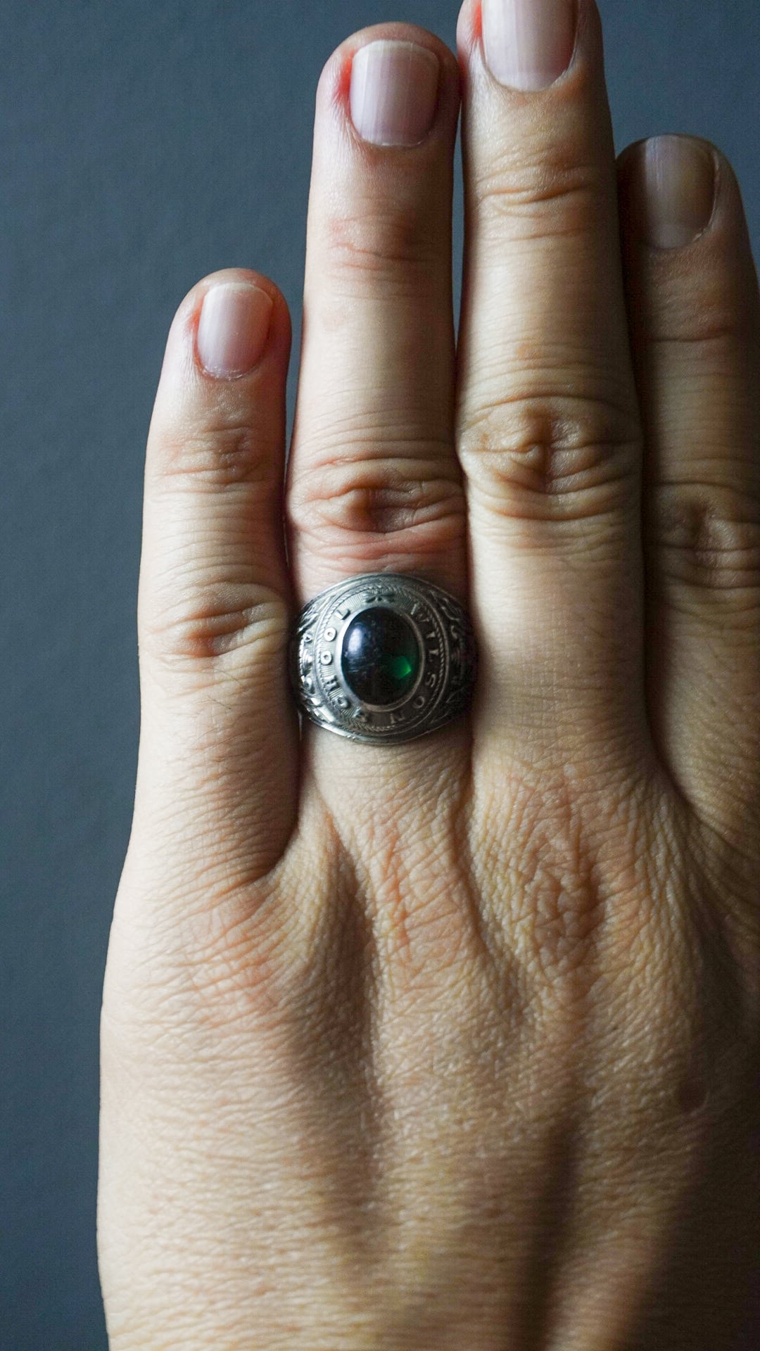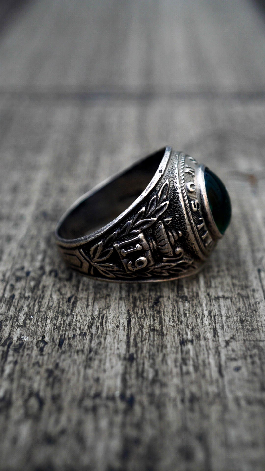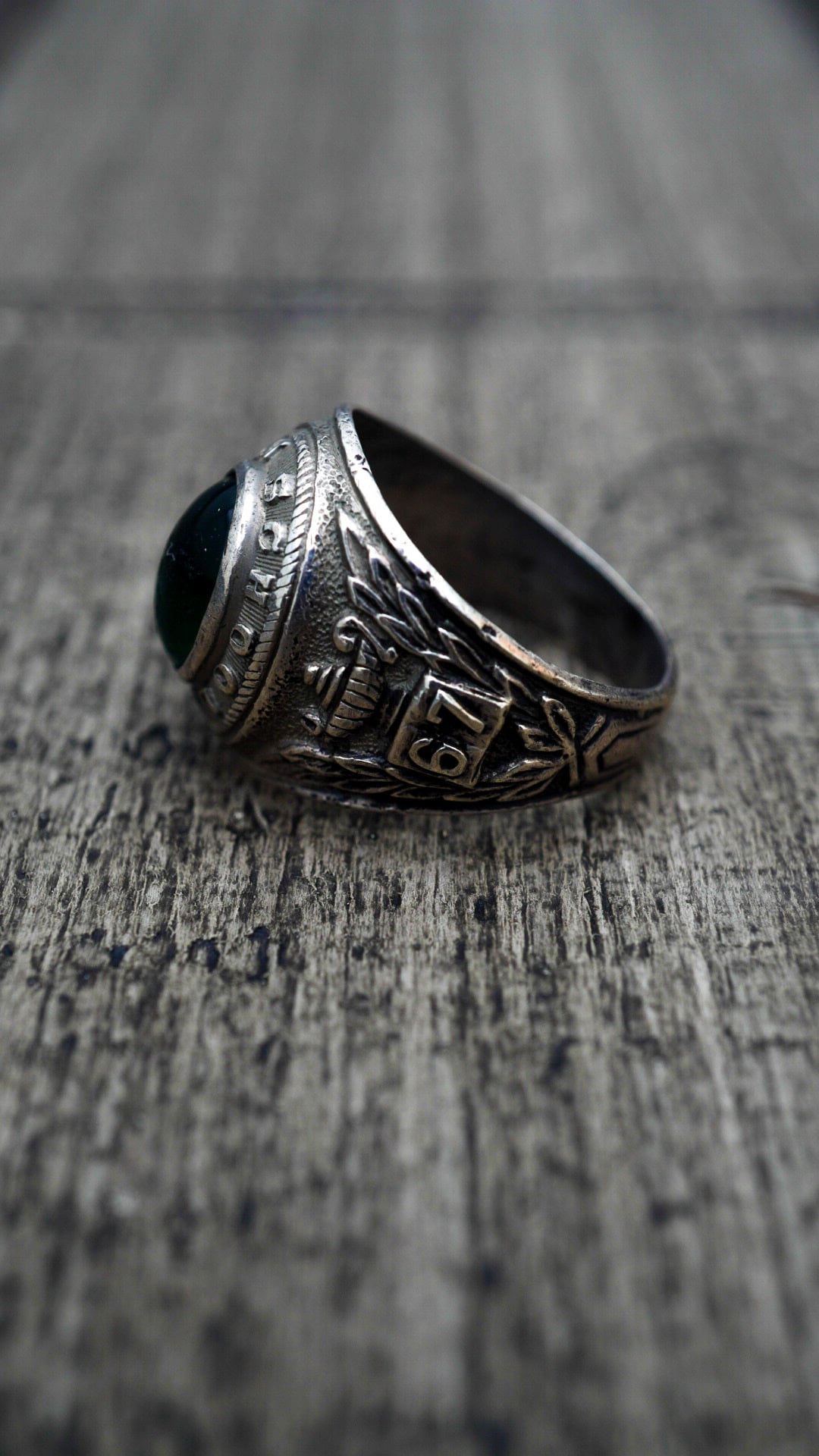 リングトップには、中央にグリーン系の石がセットされ、その周りを囲うように「WILSON SCHOOL」の文字が彫られています。