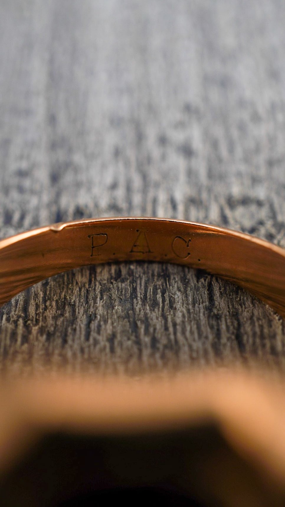 リングの裏側には、「10K」「LC.BCO」「P.A.C.(当時の所有者)」の刻印が入ります。