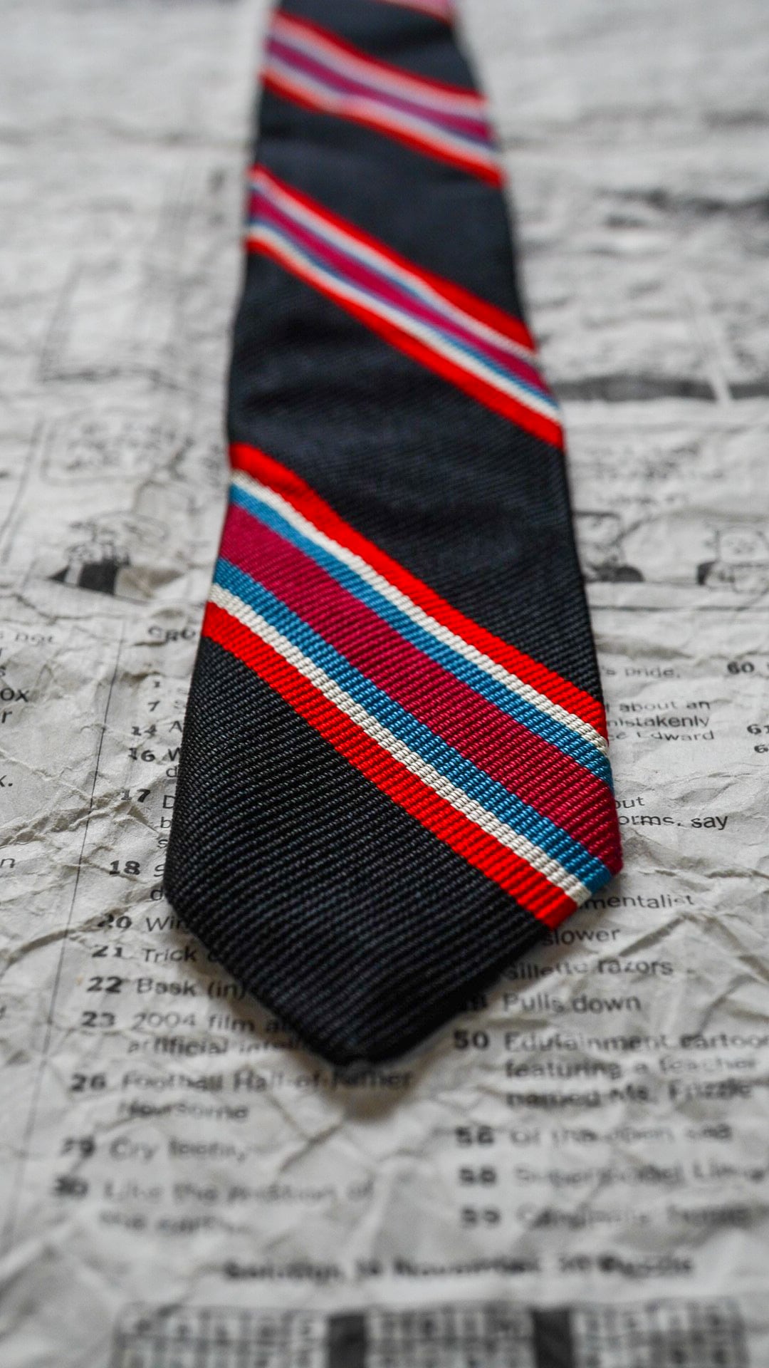 シルク100%の光沢がある生地で作られた定番のレジメンタルストライプ柄のネクタイで、カラーはブラック×レッド×ホワイト×ブルー×パープルの配色になります。