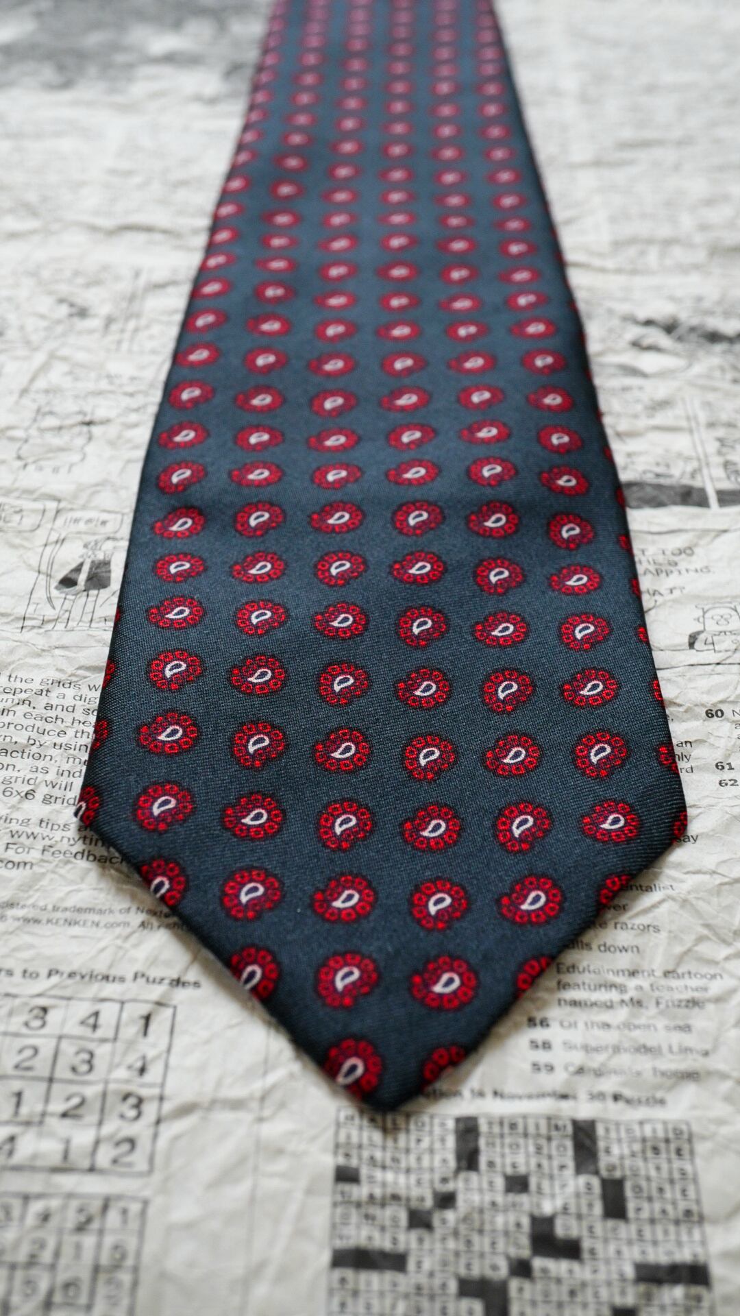 シルク100%の光沢がある生地で作られたペイズリー柄のネクタイで、ベースカラーはダークネイビー(ブラック寄りのネイビー)になります。