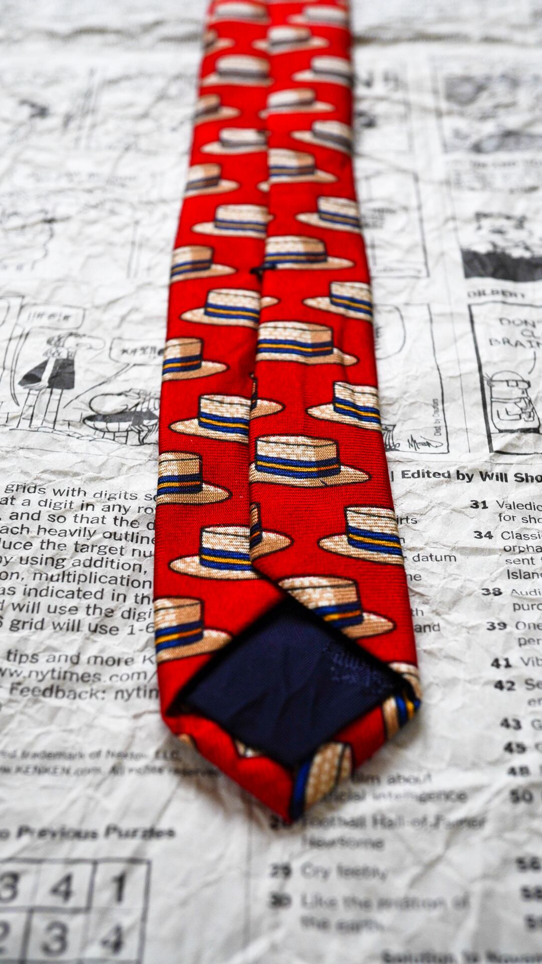 シルク100%の光沢がある生地で作られたポップなストローハット柄のネクタイで、ベースカラーはレッドになります。