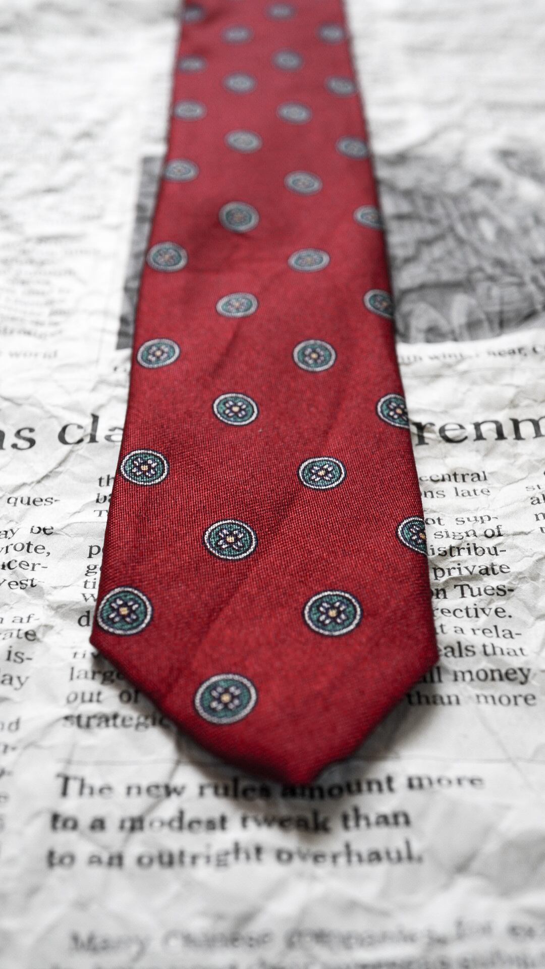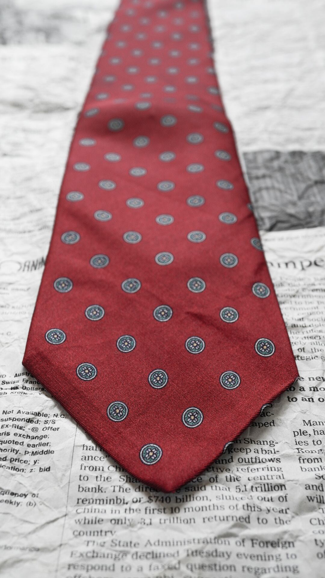 シルク100%の光沢がある生地で作られた花柄をモチーフとした小紋柄のネクタイで、ベースカラーはバーガンディになります。
