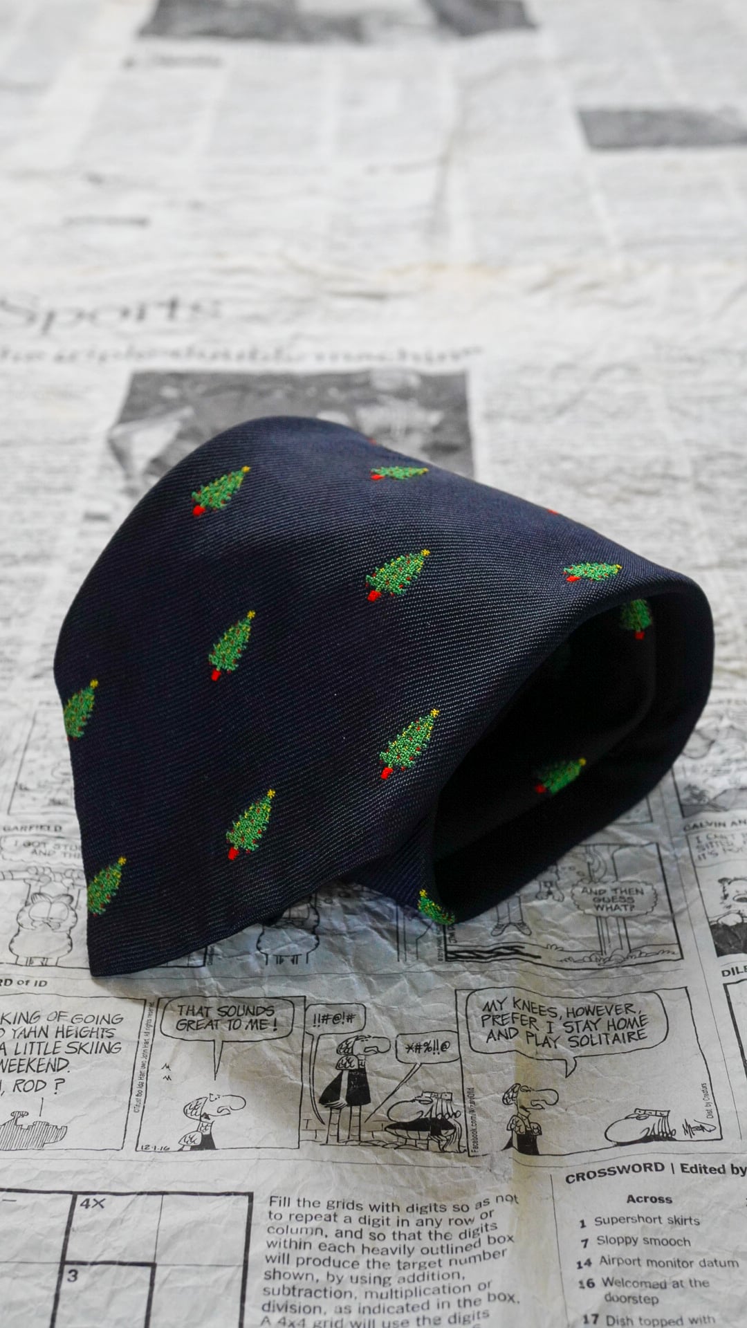 シルク100%の光沢がある生地で作られたクリスマスツリー柄のネクタイで、ベースカラーはネイビーになります。